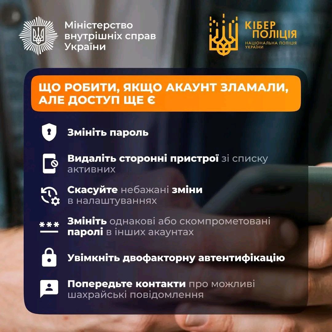 Разом з Кіберполіція розповідаємо, як вчасно розпізнати ознаки компрометації, алгоритм дій у випадку зламу та як захистити свій акаунт.