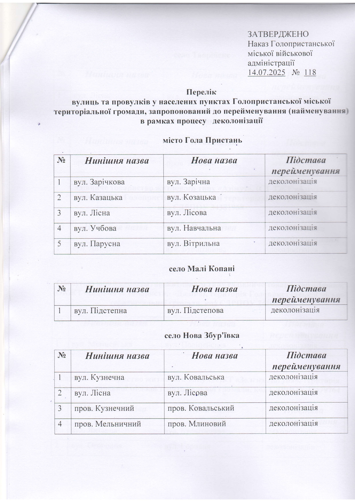 Інформаційне повідомлення щодо перейменування вулиць та провулків в населених пунктах Голопристанської міської територіальної громади Скадовського району Херсонської області.