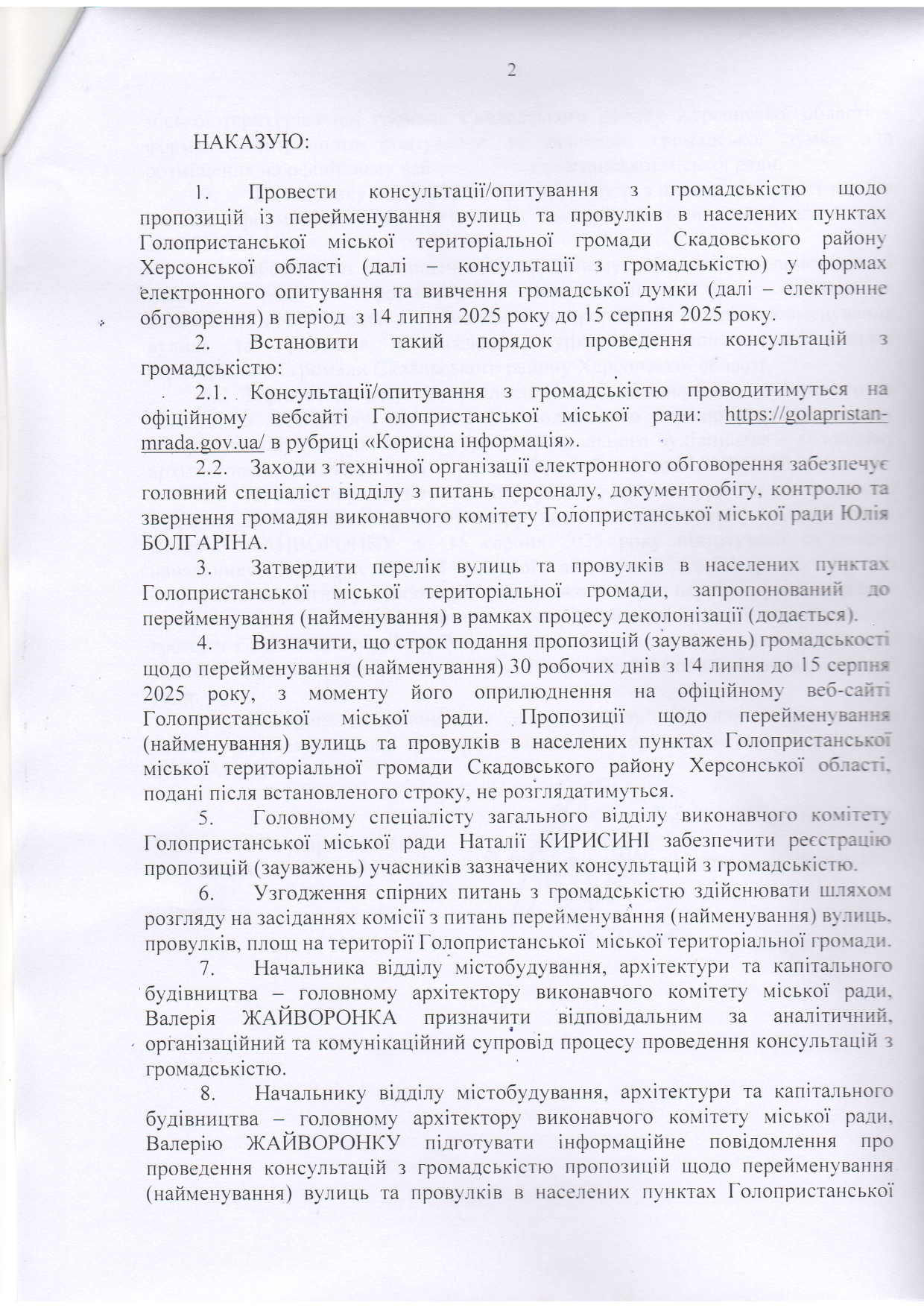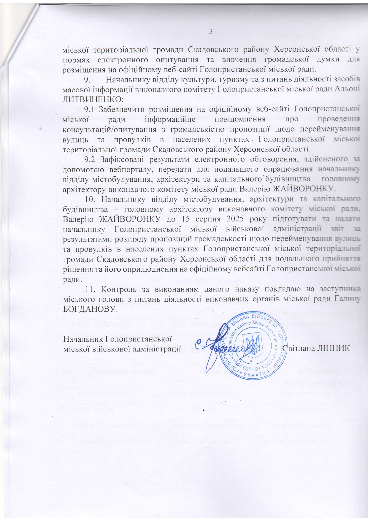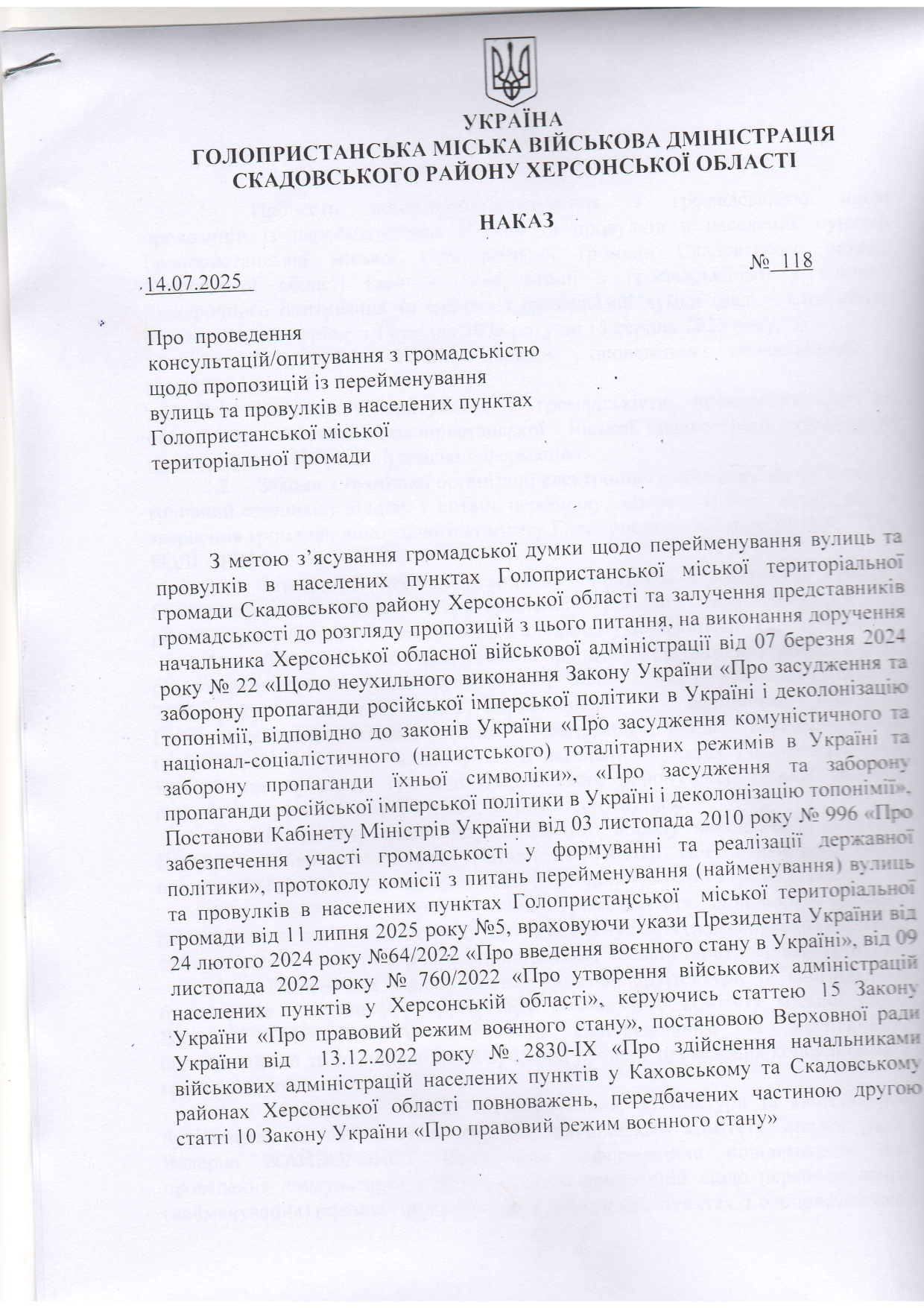 Голопристанська міська військова адміністрація інформує про початок проведення консультацій/опитування з громадськістю щодо перейменування вулиць та провулків в населених пунктах Голопристанської міської територіальної громади Скадовського району Херсонської області у формах електронного опитування та вивчення громадської думки і запрошує жителів Голопристанської міської територіальної громади Скадовського району Херсонської області, які на момент обговорення досягли вісімнадцяти років та місце проживання яких зареєстровано/задекларовано на території Голопристанської міської територіальної громади долучитись до обговорення даного питання.