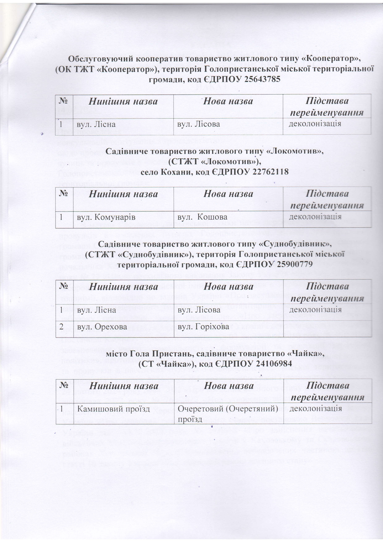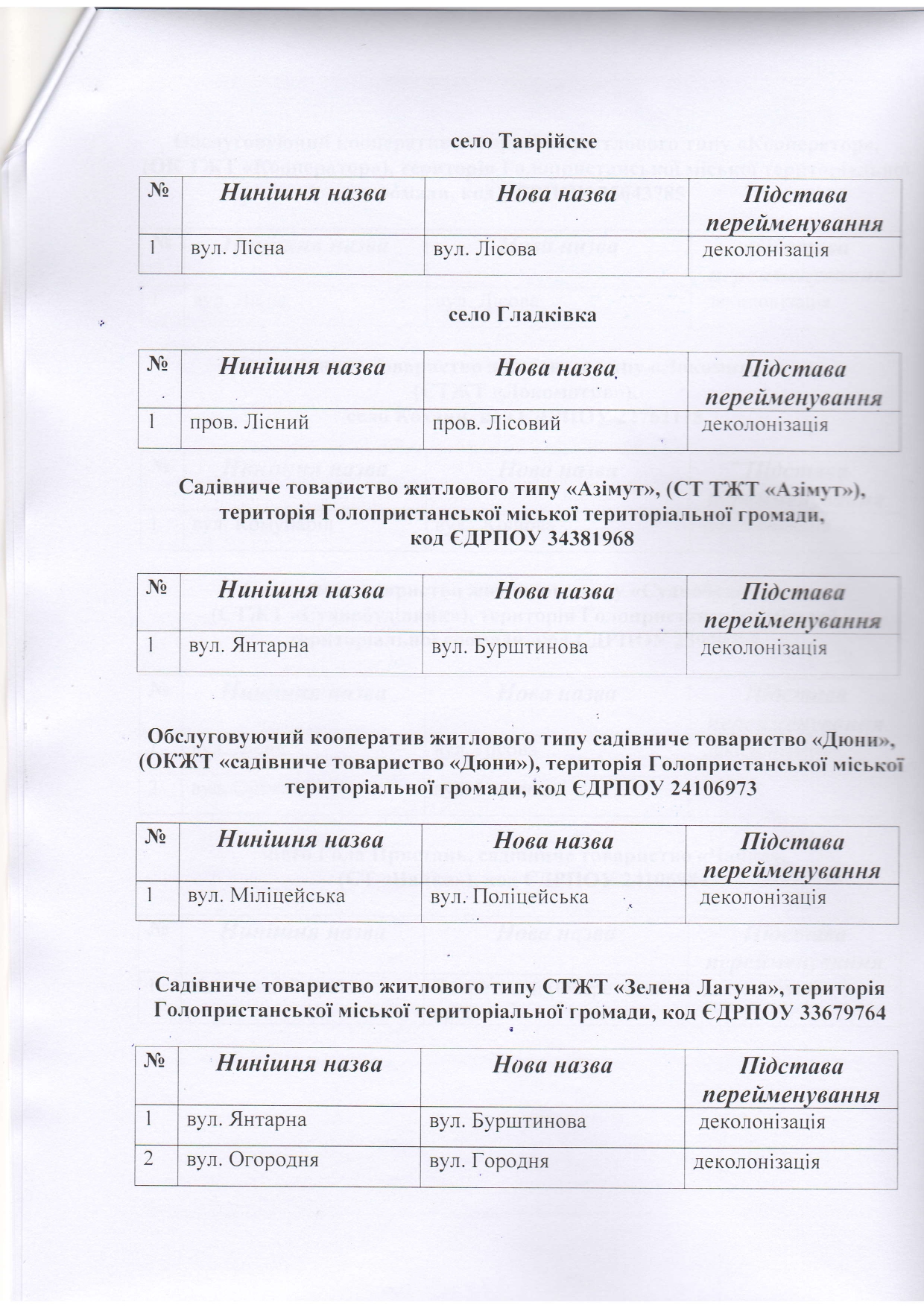 Щодо перейменування вулиць та провулків в населених пунктах Голопристанської міської територіальної громади Скадовського району Херсонської області