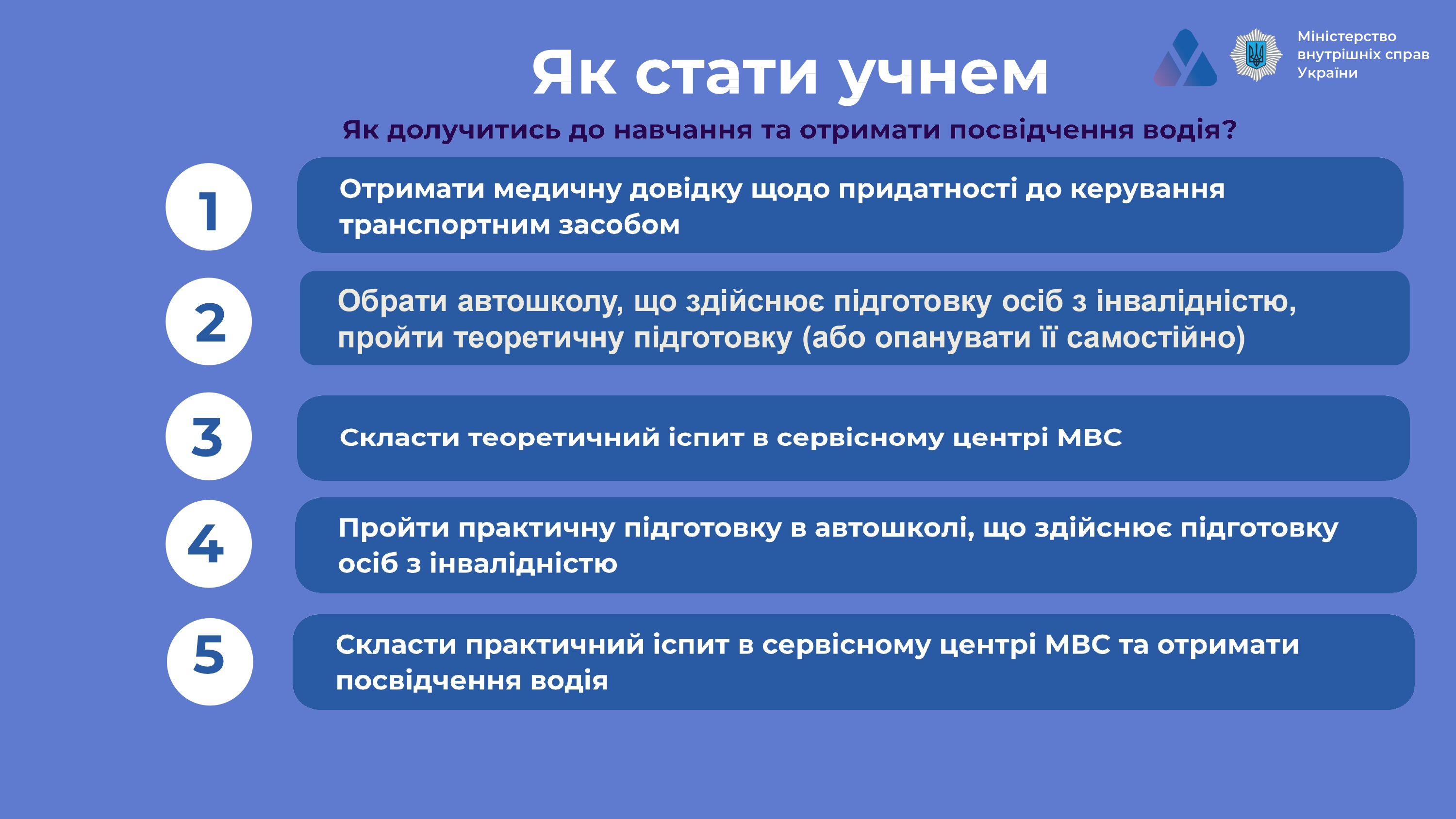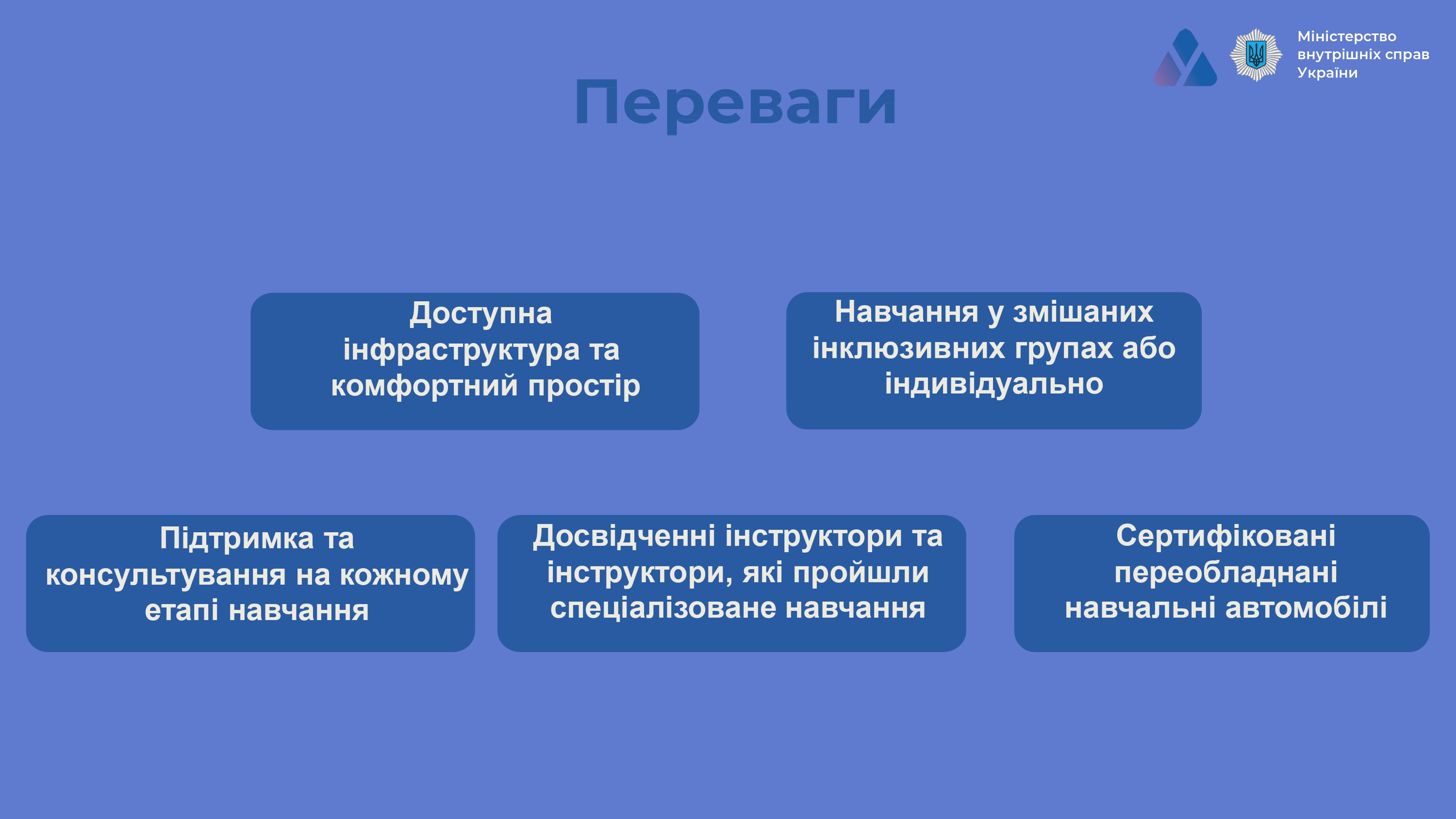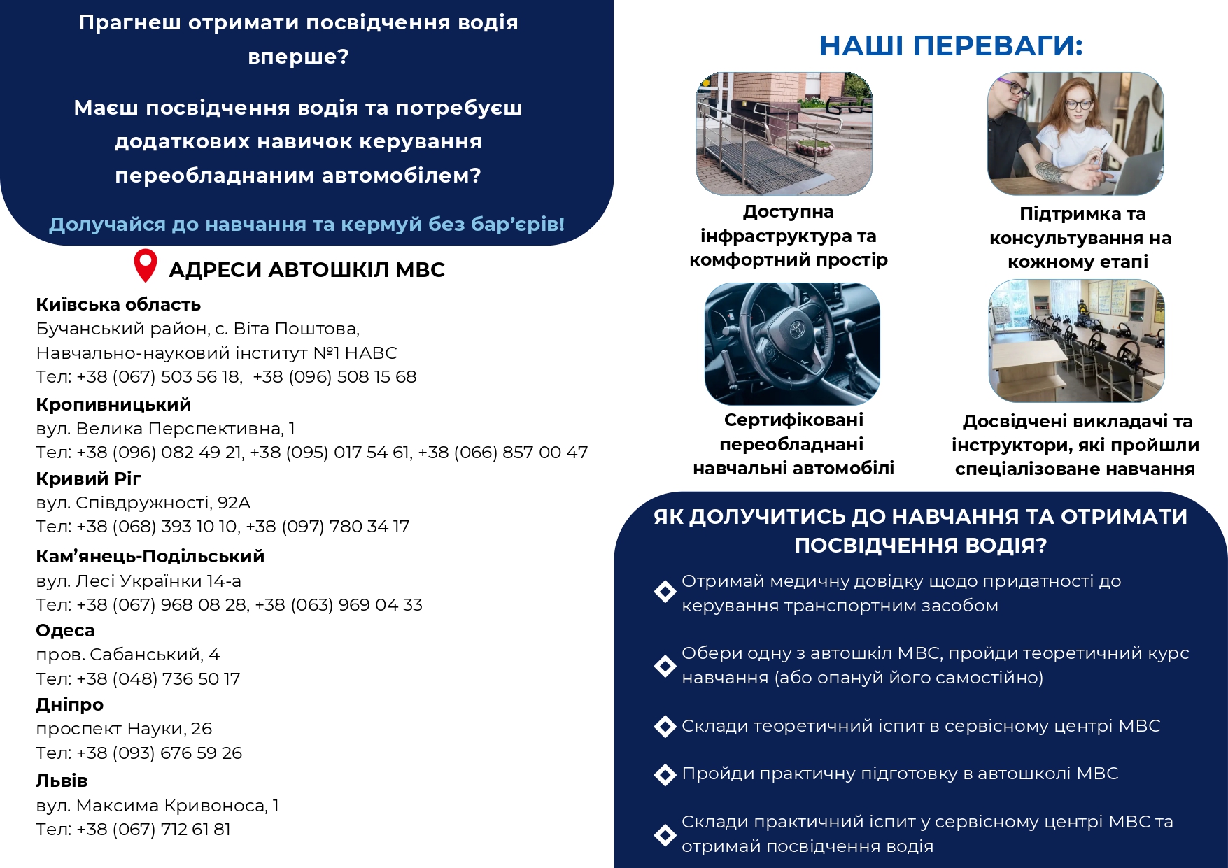 «Автошколи для осіб з інвалідністю» - це флагманський проект Міністерства внутрішніх справ України, який реалізується у рамках ініціативи «Без барʼєрів» Першої леді України Олени Зеленської.