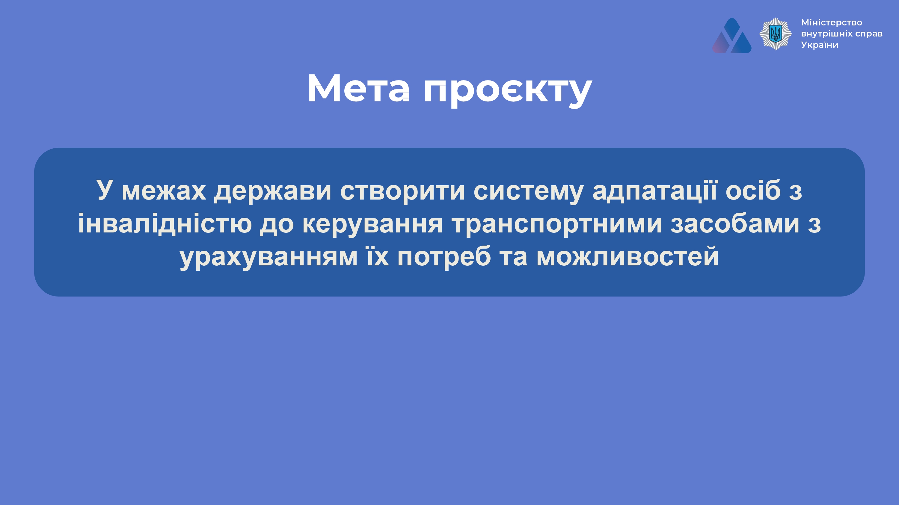 Мета проєкту – у межах держави створити систему адаптації осіб з інвалідністю до керування транспортними засобами з урахуванням їх потреб та можливостей.