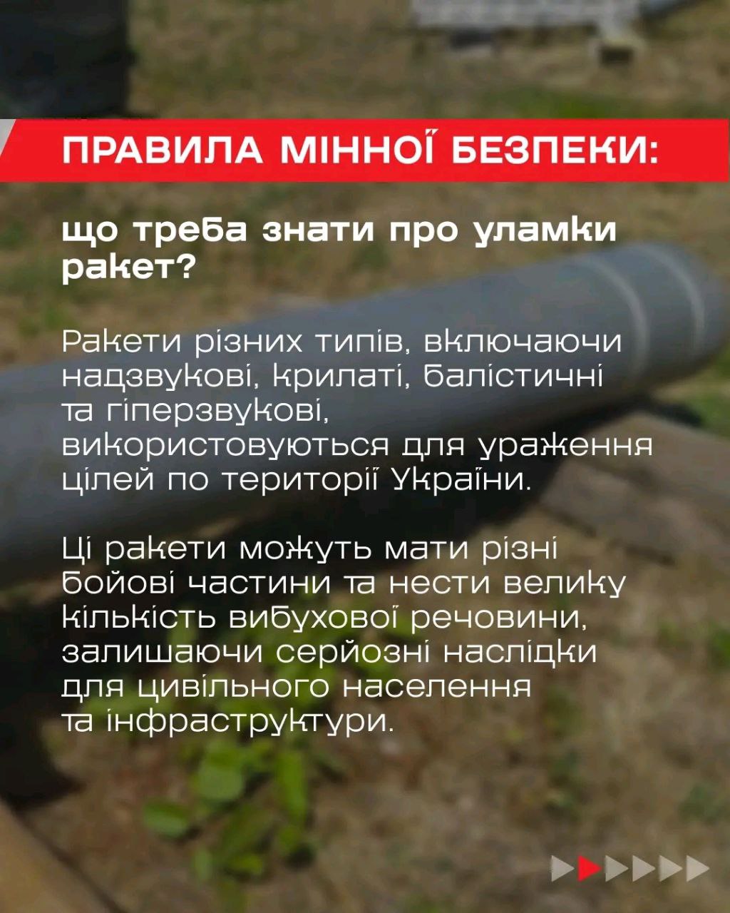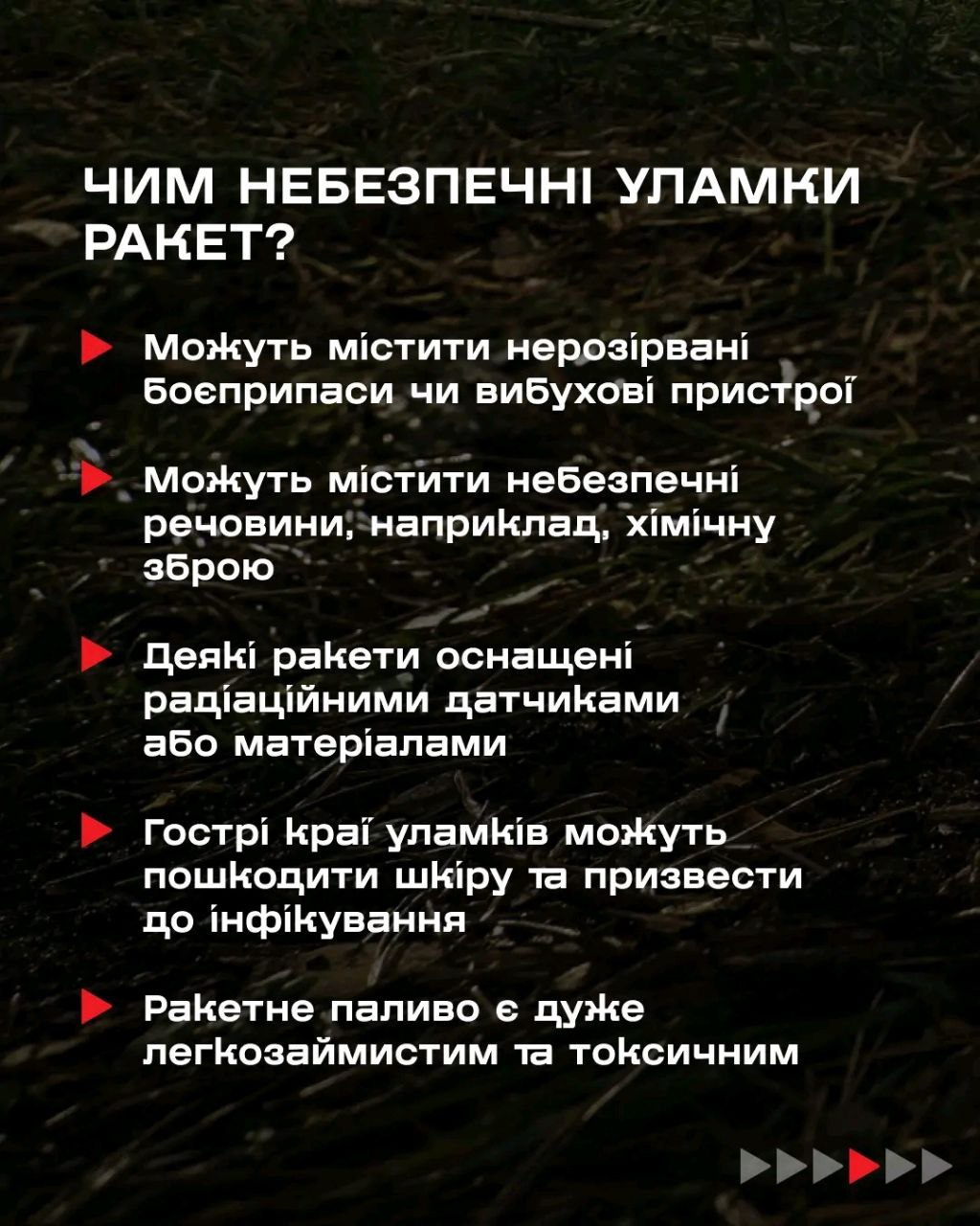 Гортай карусель і дізнайся, яку загрозу приховують залишки ракет. Та пам’ятай головні правила безпеки, якщо натрапиш на підозрілий предмет:
