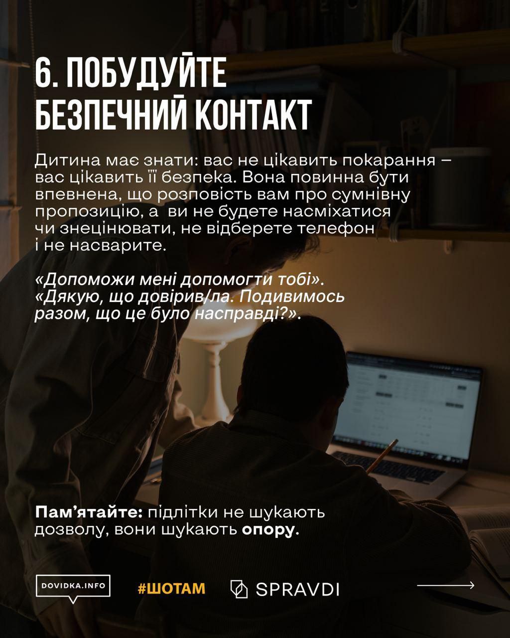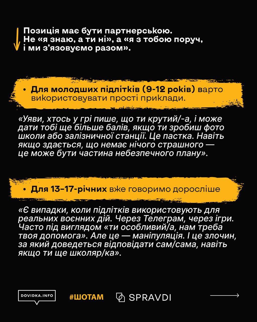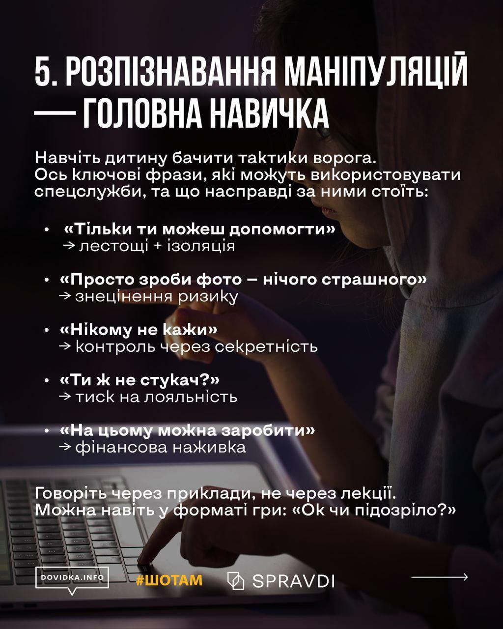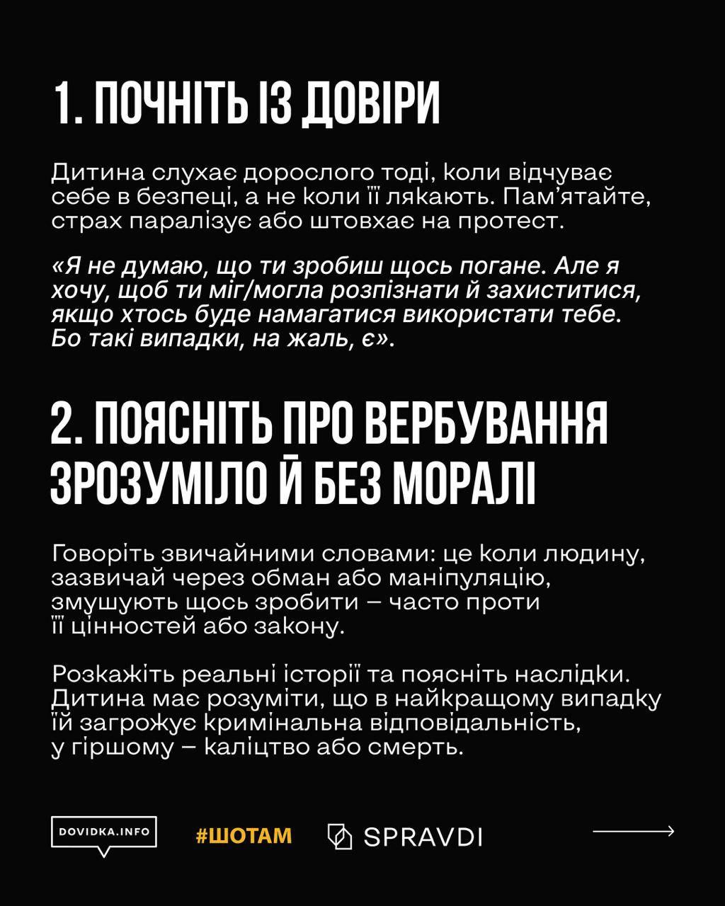 Детальніше про те, як пояснити дитині про вербування та його наслідки – у матеріалі Центру стратегічних комунікацій, проєкту Dovidka.info та медіа «Шотам».