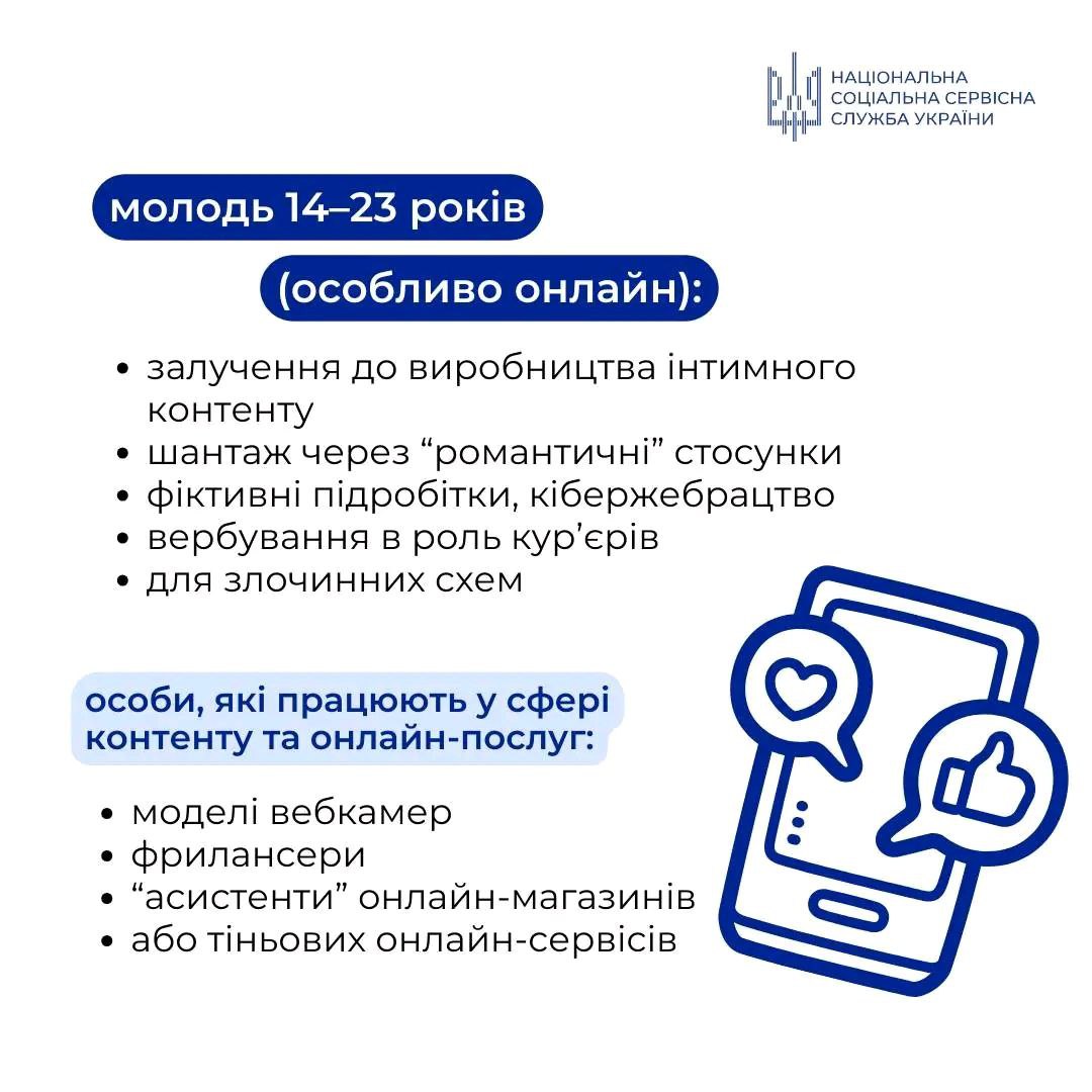 З початку 2025 року Нацсоцслужба встановила 379 статусів особам, постраждалим від торгівлі людьми, більшість із них – чоловіки. Найбільш поширеними формами експлуатації залишається трудова, сексуальна та змішана, зокрема під час використання в збройному конфлікті.