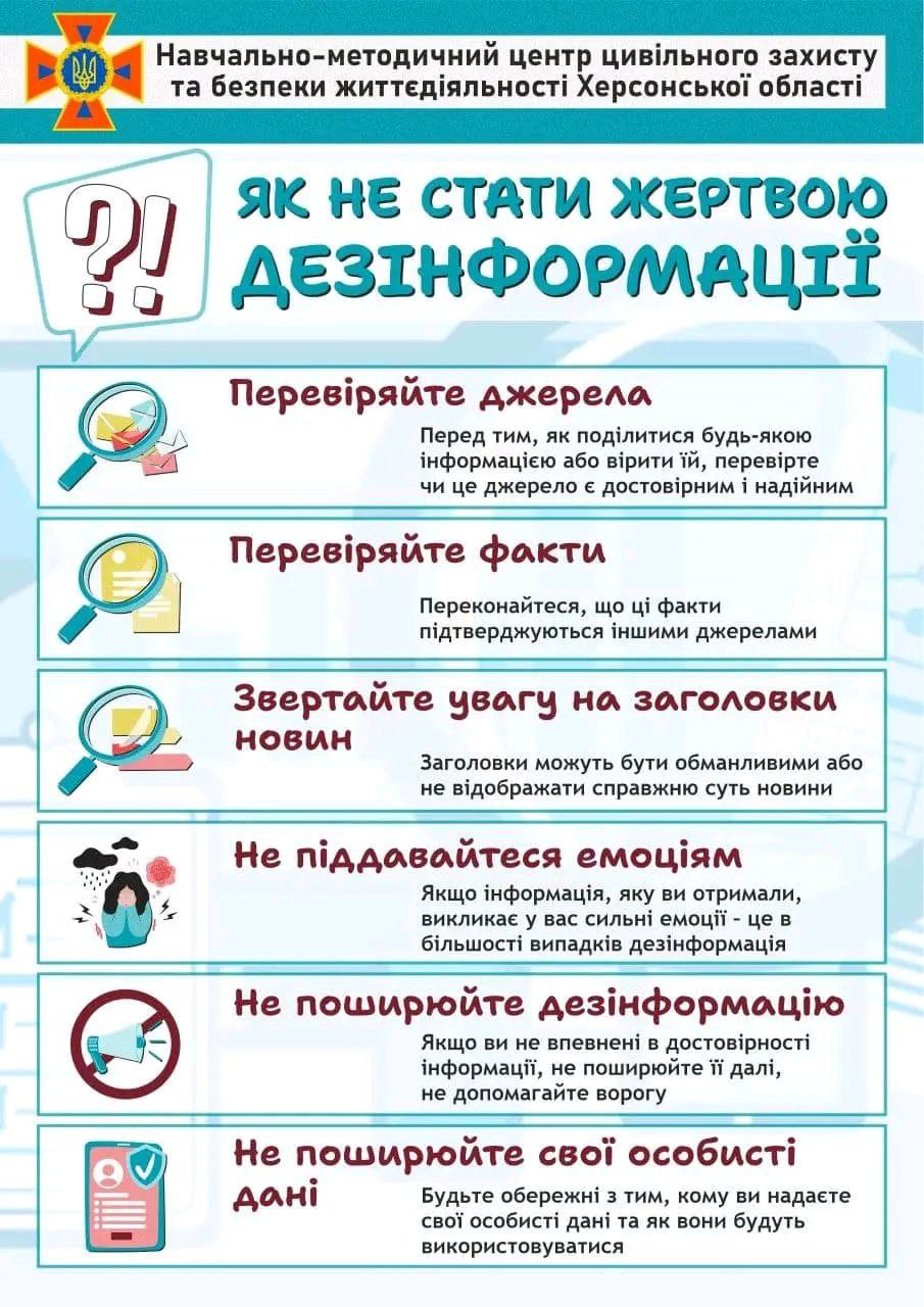 Як не стати заручником неправдивої інформації — дивіться у пам'ятці від Навчально-методичний Центр ЦЗ та БЖД Херсонської області.