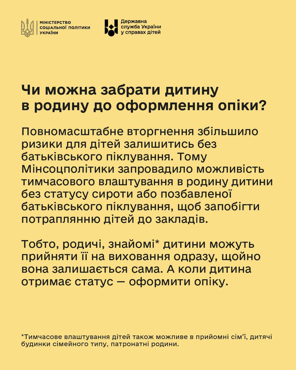 Опіка та піклування — найбільш поширена сімейна форма виховання. Із 62 тисяч дітей-сиріт і дітей, позбавлених батьківського піклування, 44 тисячі зростають в родинах опікунів і піклувальників.