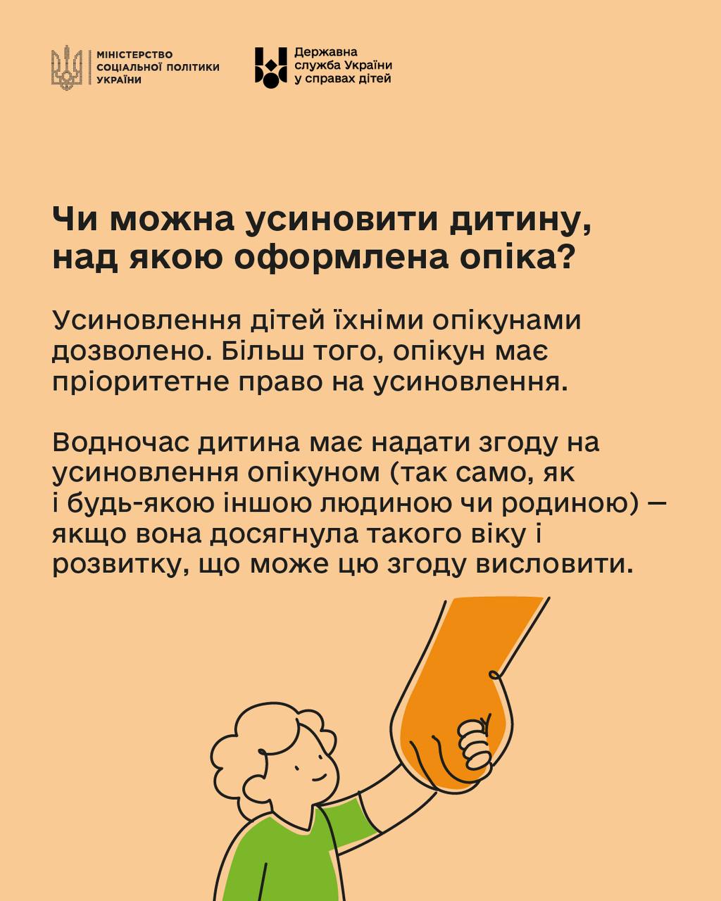 Сьогодні разом з Державною службою України у справах дітей відповідаємо на поширені питання про цю сімейну форму: чи правда, що оформити можуть тільки родичі; які виплати нараховуються на дитину; чи може людина усиновити дитину, над якою взяла опіку, тощо? Гортайте картки.