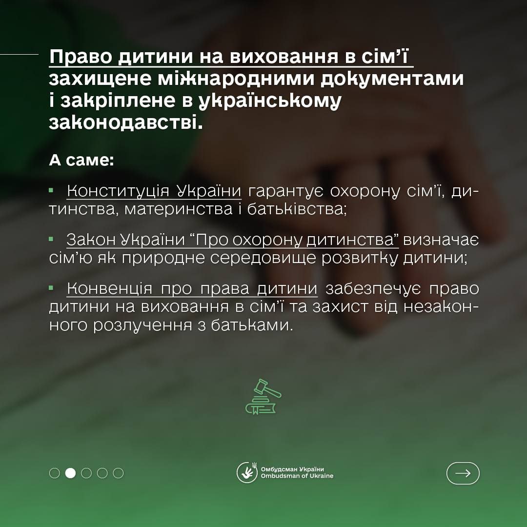 Омбудсман України Дмитро Лубінець розʼяснив, що кожна дитина має право зростати в сім’ї, де вона відчуває любов, піклування та безпеку. Сім’я є основним середовищем для розвитку особистості та формування моральних цінностей.