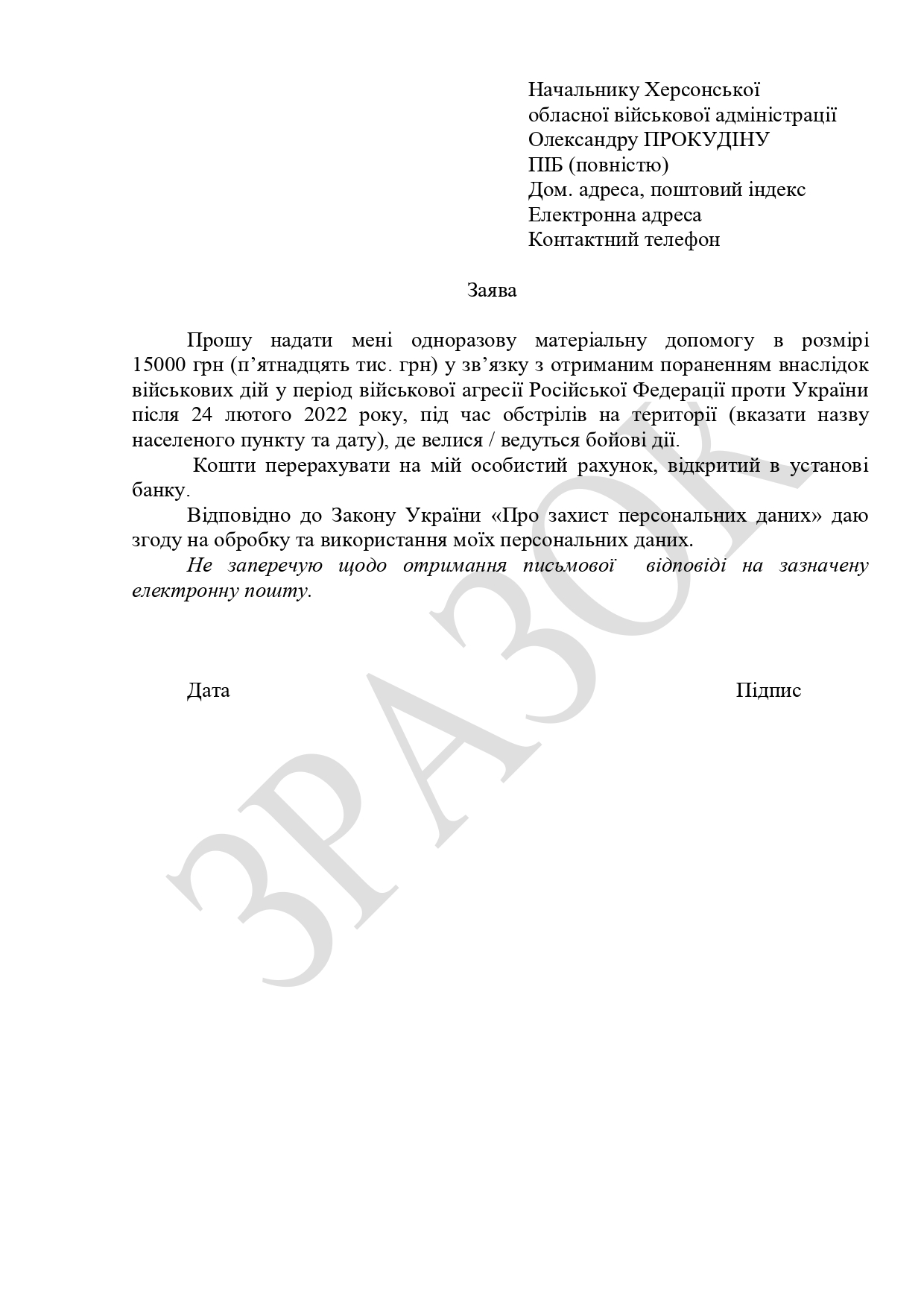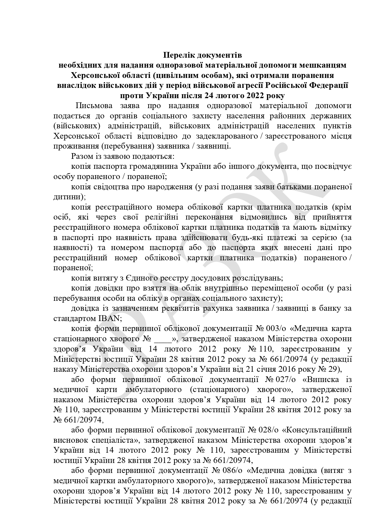 - мешканцям Херсонської області (цивільним особам), які отримали поранення внаслідок військових дій у період військової агресії Російської Федерації проти України після 24 лютого 2022 року, за рахунок коштів обласного бюджету Херсонської області;