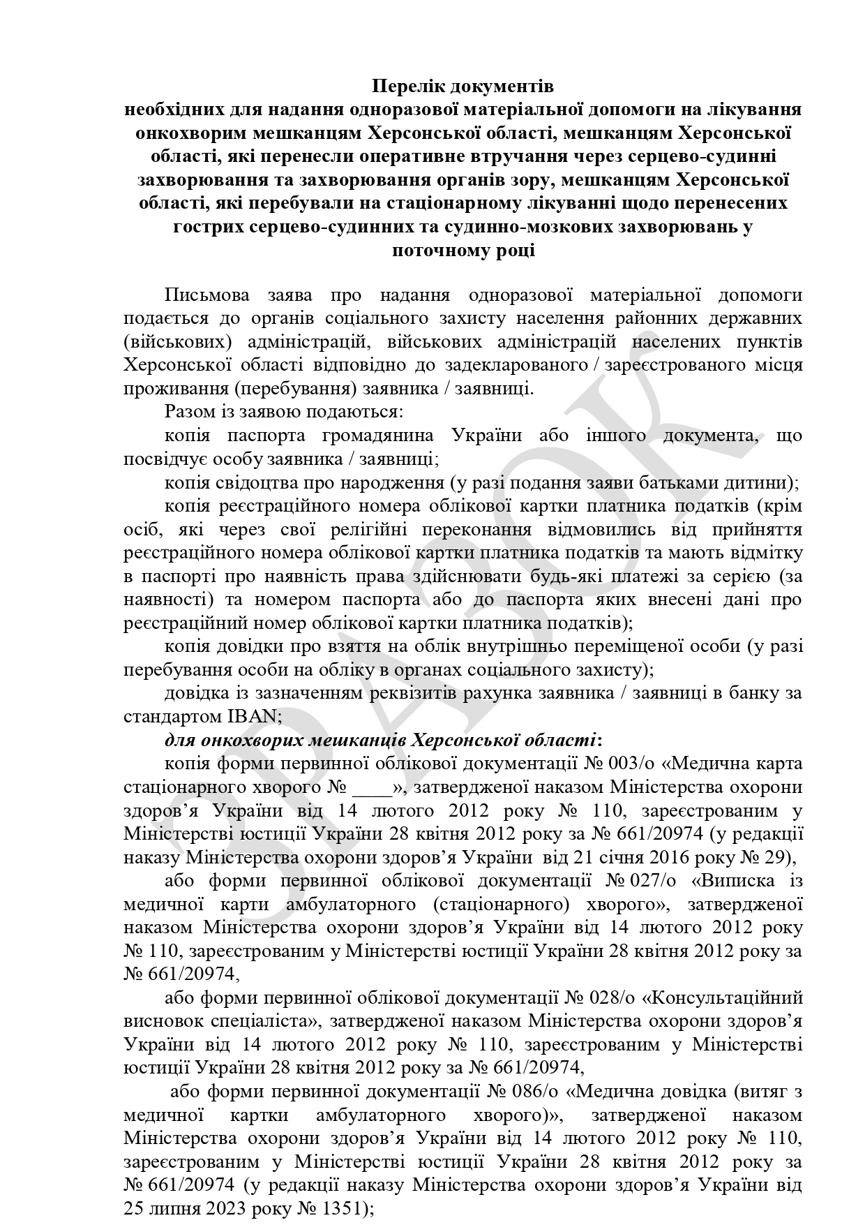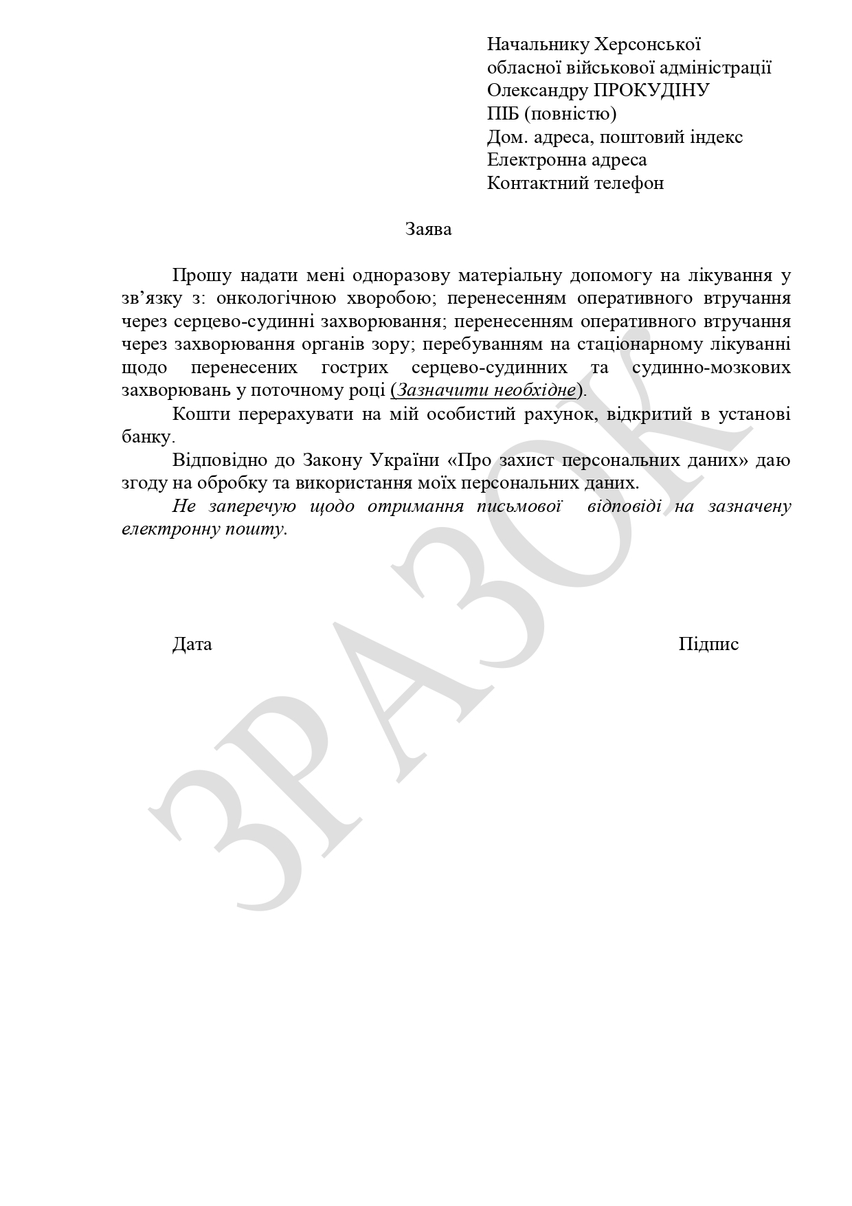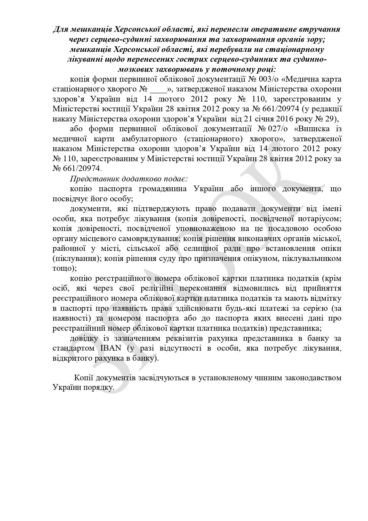 - на лікування онкохворим мешканцям Херсонської області, мешканцям Херсонської області, які перенесли оперативне втручання через серцево судинні захворювання та захворювання органів зору, мешканцям Херсонської області, які перебували на стаціонарному лікуванні щодо перенесених гострих серцево-судинних та судинно-мозкових захворювань у поточному році;