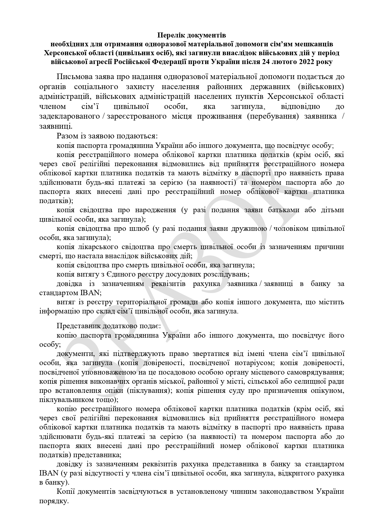 - сім’ям мешканців Херсонської області (цивільних осіб), які загинули внаслідок військових дій у період військової агресії Російської Федерації проти України після 24 лютого 2022 року.