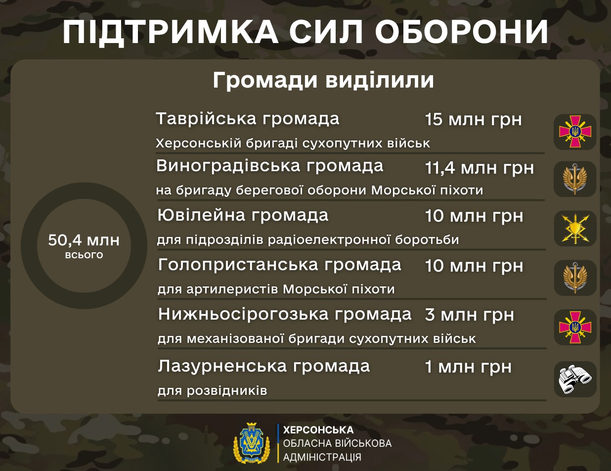Понад 50 млн грн коштом місцевих бюджетів області у межах спільного проєкту Херсонської ОВА та місцевих громад перерахували на потреби наших воїнів.