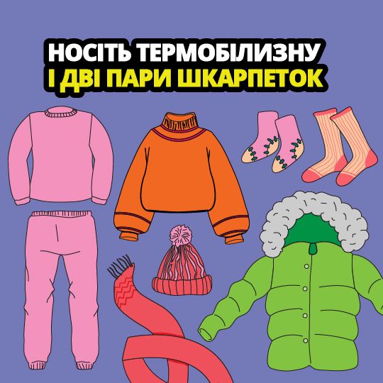 - Носіть термобілизну і дві пари шкарпеток (наприклад, на тонші бавовняні вдягніть товстіші вовняні).