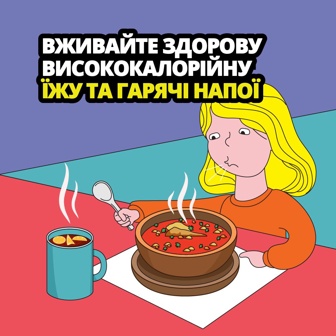 - Вживайте здорову висококалорійну їжу та гарячі напої.