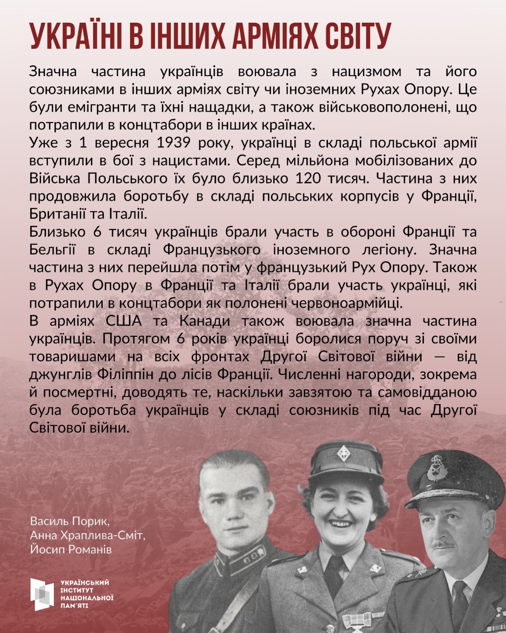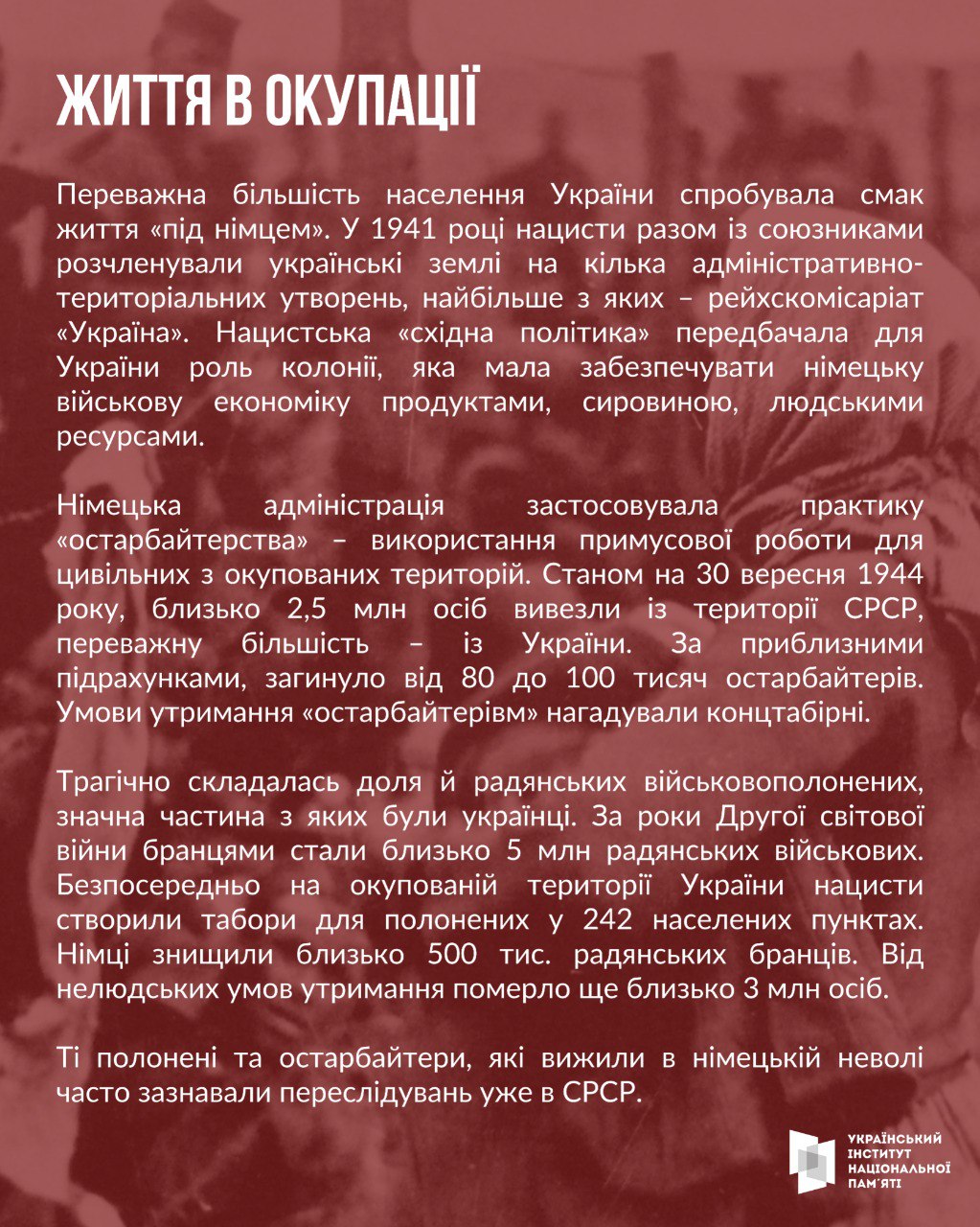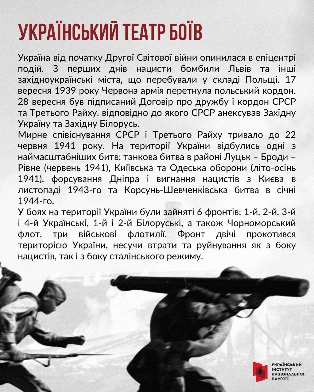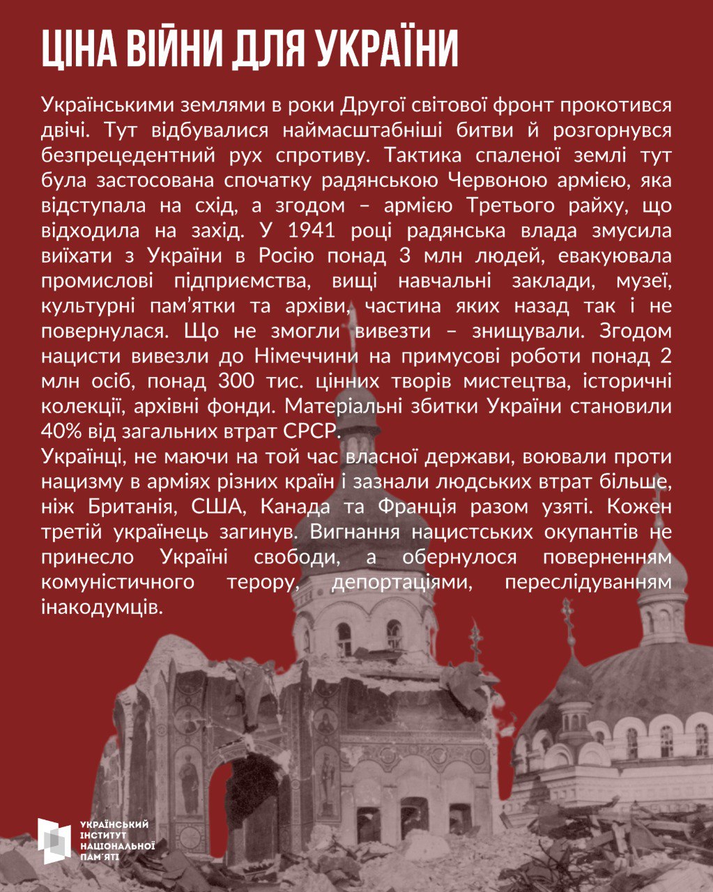 Цьогоріч світ відзначає 80-річницю перемоги над нацизмом у Другій світовій війні. До цієї дати команда Українського інституту національної пам’яті підготувала банерну виставку «Україна у вирі Другої світової війни», яку можна переглянути на Контрактовій площі у Києві.