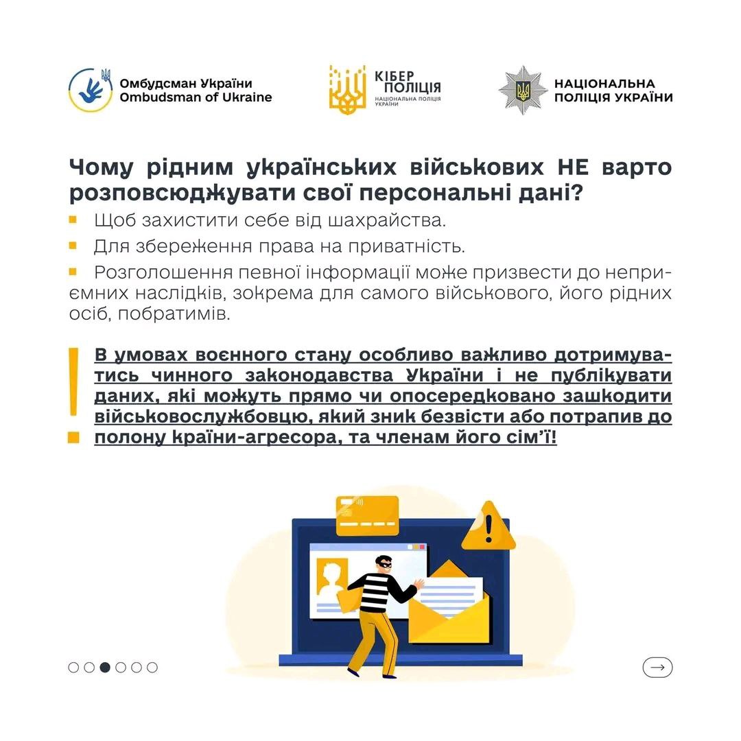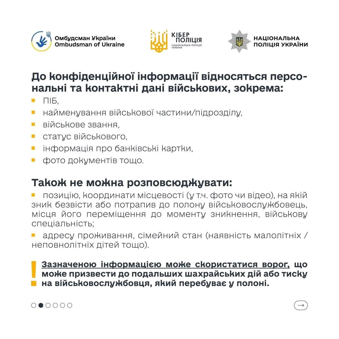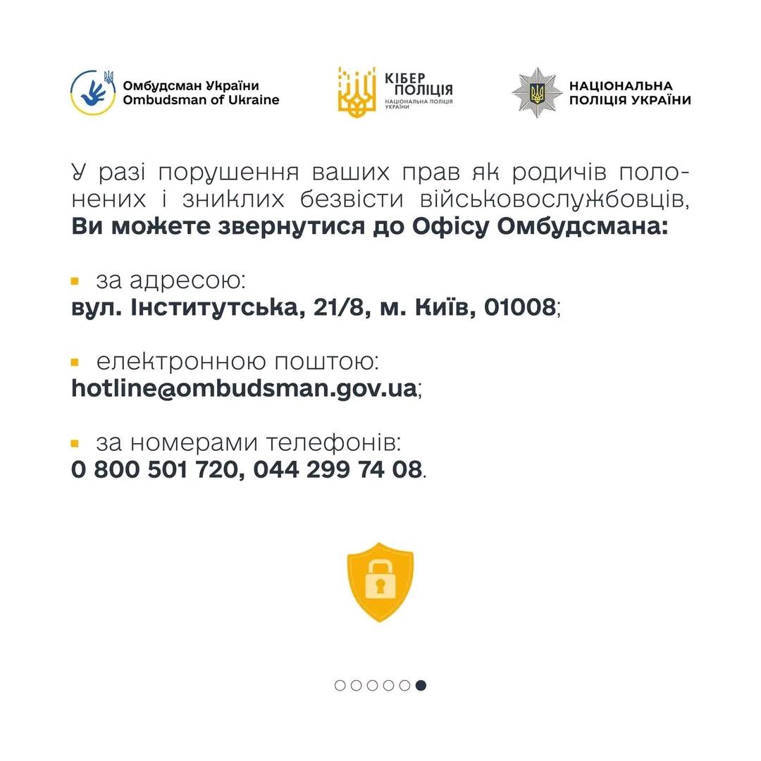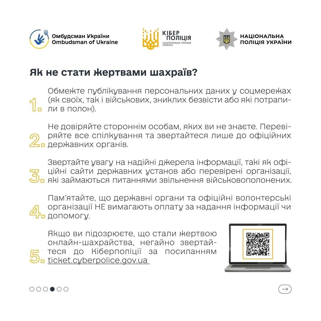 Детальніше про те, яким може бути шахрайство на темі військовополонених та зниклих безвісти дізнавайтеся у спеціальній брошурі (https://www.ombudsman.gov.ua/storage/app/media/uploaded-files/yakim-mozhe-buti-shakhraistvo-veb.pdf ), яку Офіс Омбудсмана України підготував спільно з Кіберполіцією.