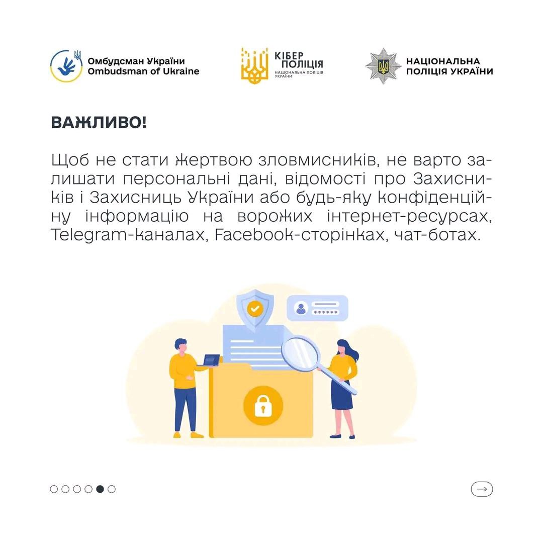 Шахраї активно моніторять соцмережі у пошуках повідомлень від родичів полонених чи зниклих безвісти військовослужбовців. Вони створюють фейкові акаунти, маскуючись під державні установи чи міжнародні організації, щоб виманити гроші. Проте, жодна офіційна структура чи волонтерська організація не буде вимагає оплату за інформацію або допомогу. В інфографіці читайте, чому НЕ варто поширювати свої персональні дані.