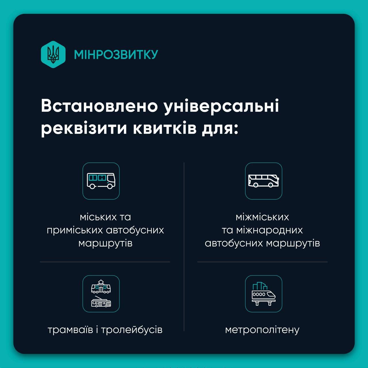 Нові квитки матимуть єдині обов’язкові реквізити: інформацію про вартість, дату та час відправлення чи строк дії, дані перевізника і страховика, унікальний ідентифікатор, а також QR-код за потреби).