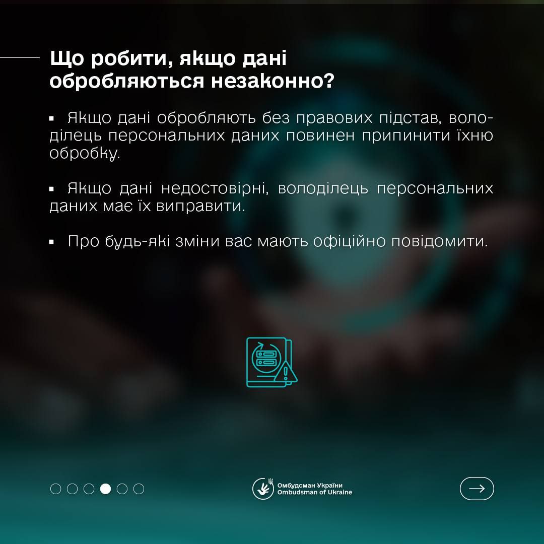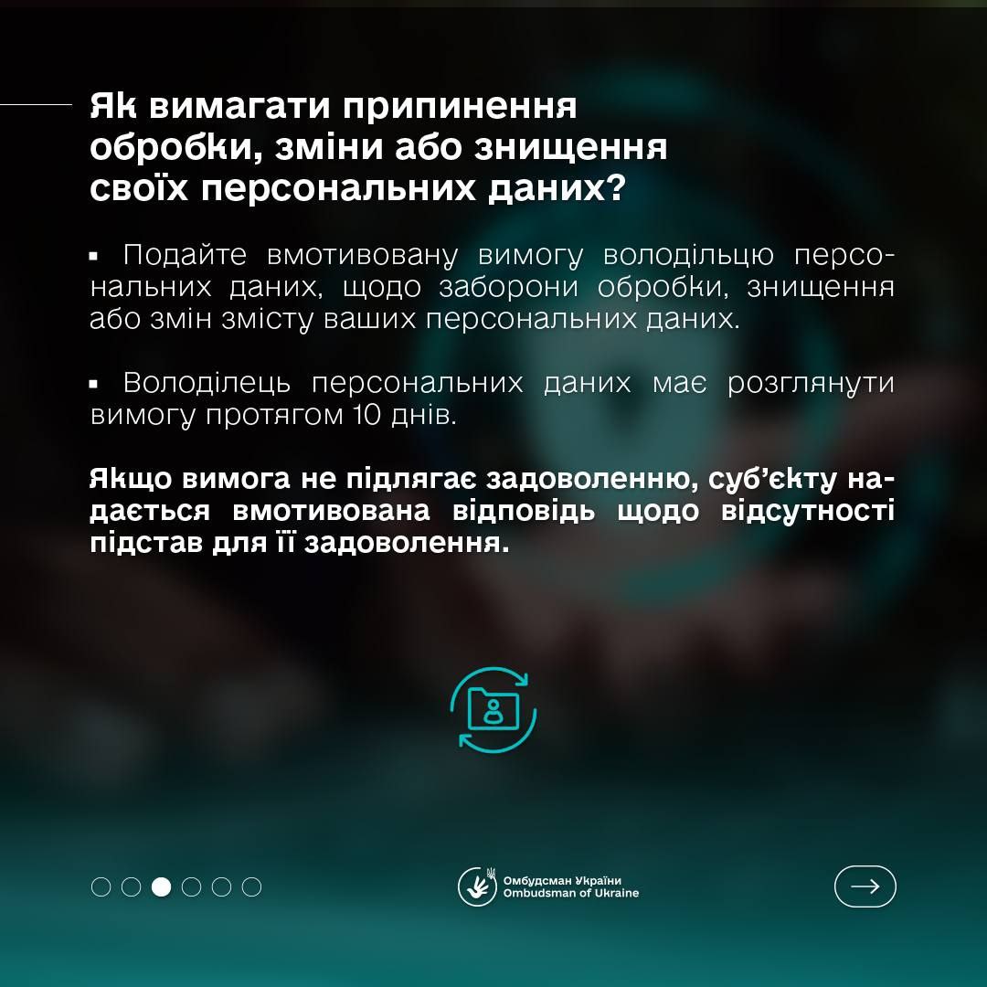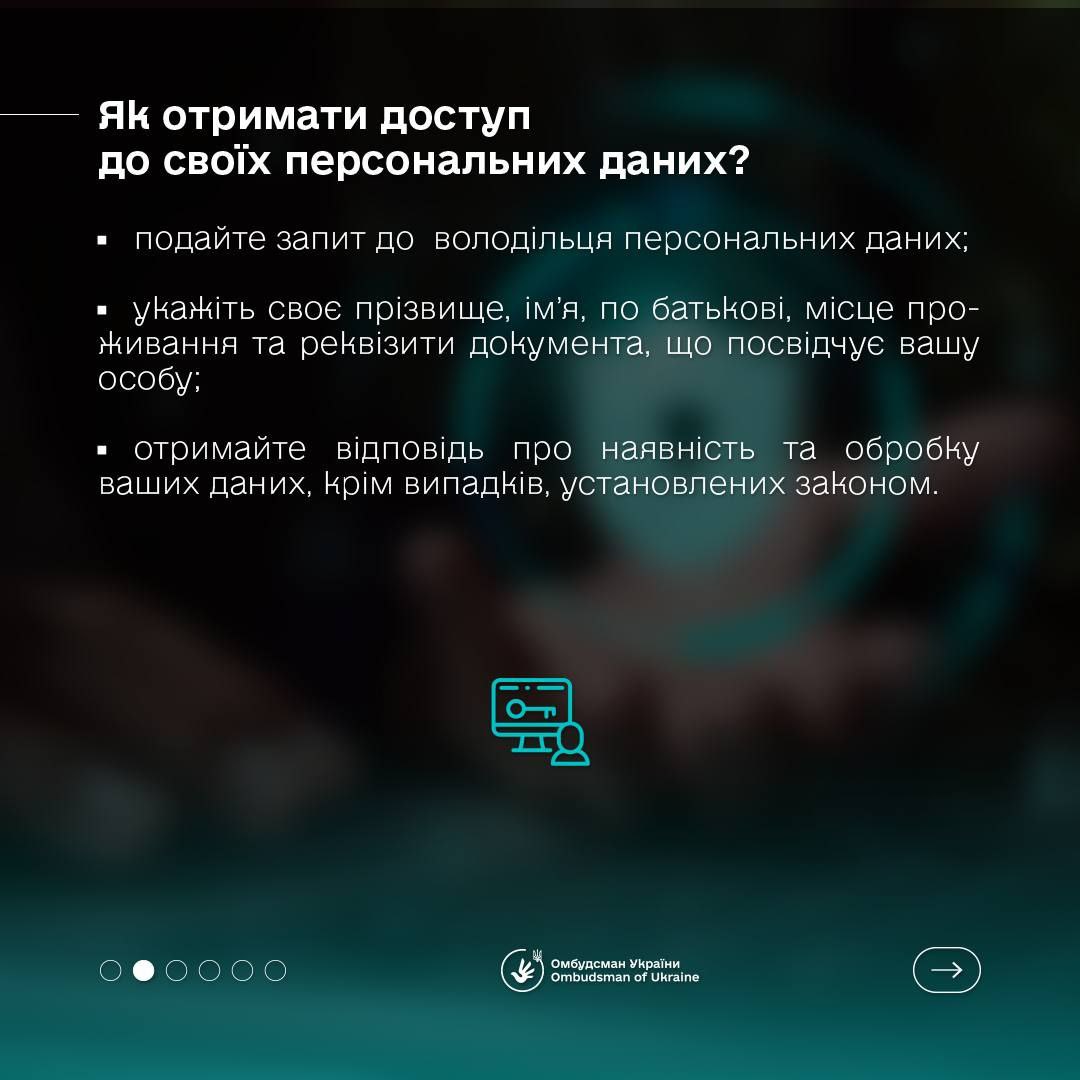 Кожен має право знати, хто і як обробляє його персональні дані. Ви можете отримати доступ до своїх персональних даних, вимагати їхнього виправлення, знищення або припинення обробки, якщо вони використовуються незаконно.
