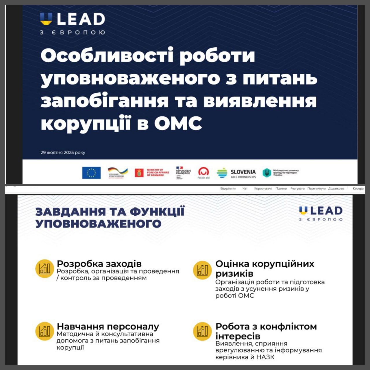 Начальник відділу правової роботи Голопристанської міської військової адміністрації долучилась до вебінару "Особливості роботи уповноваженого з питань запобігання та виявлення корупції в ОМС", організованого U-LEAD 29.10.2025року.