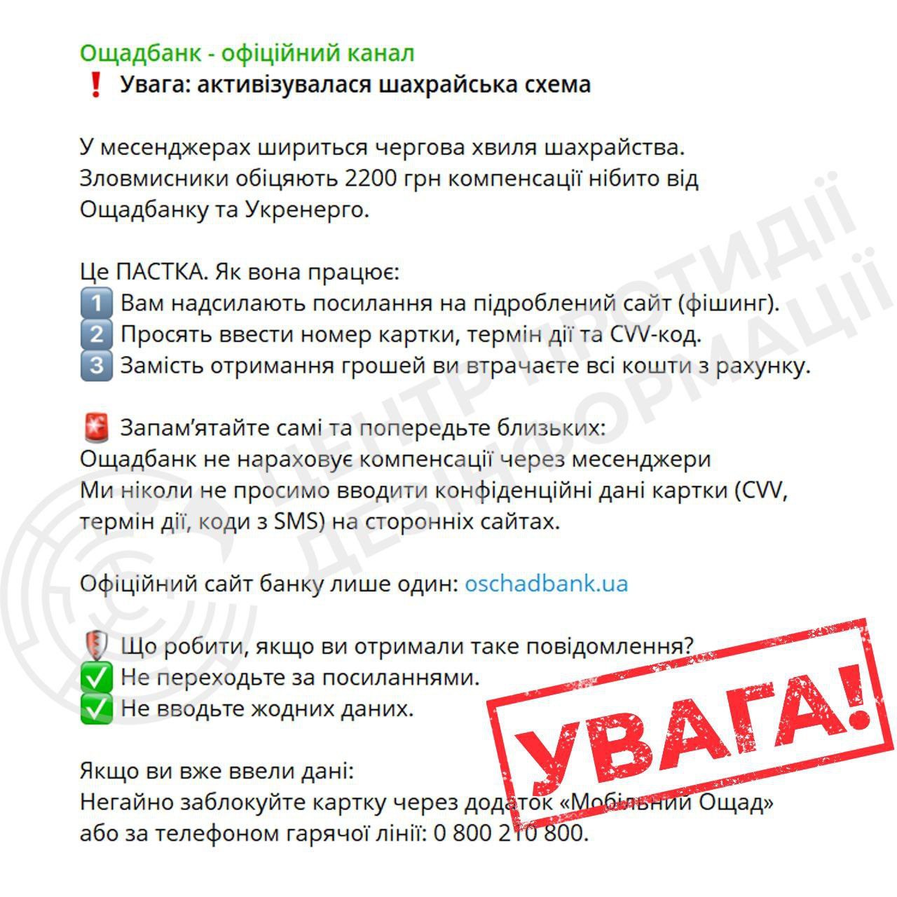 У месенджерах фіксується чергова хвиля шахрайських повідомлень про нібито виплату 2200 грн компенсації від «Ощадбанку» та «Укренерго»