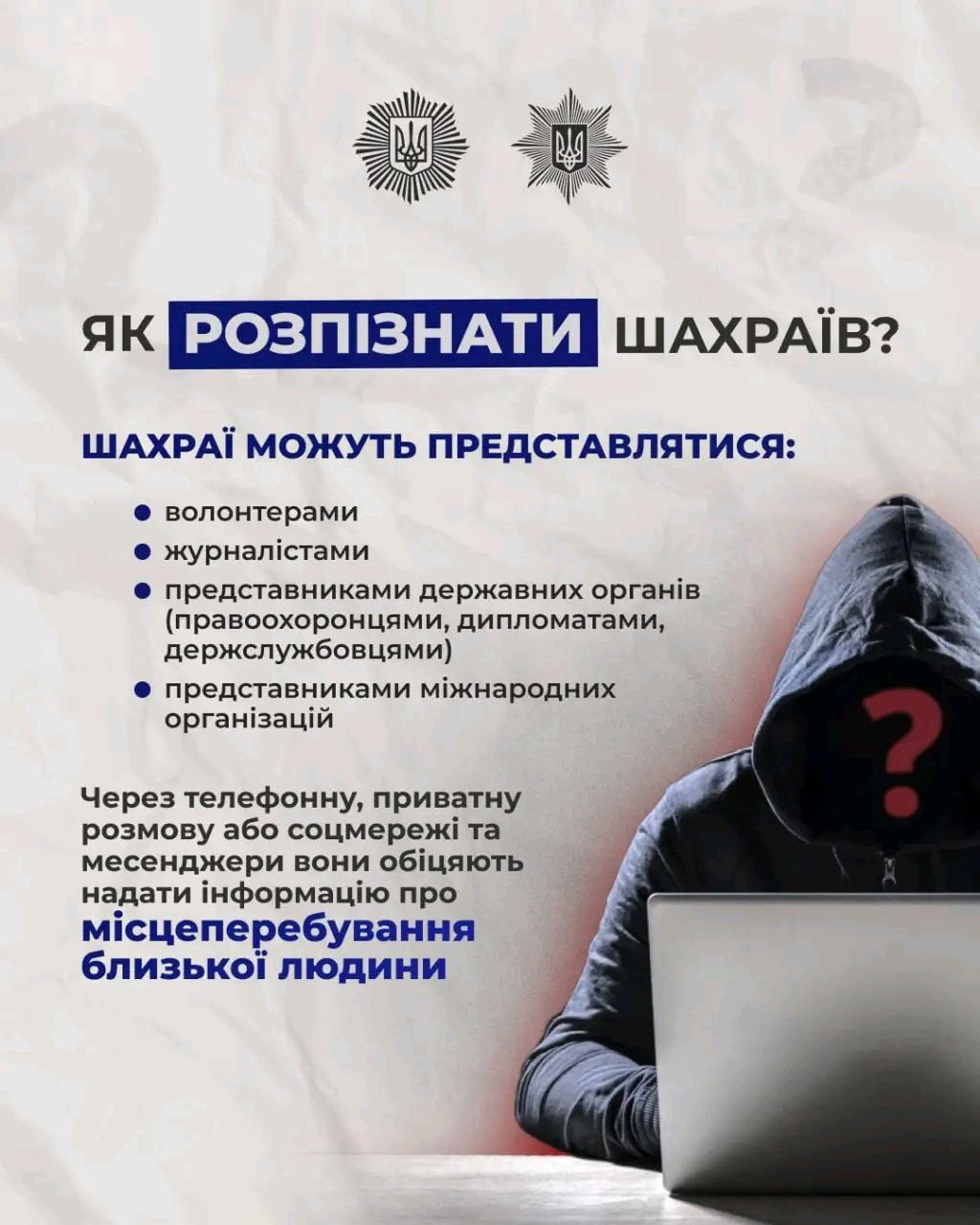 Зловмисники використовують емоційний стан людей, що шукають близьких, видаючи себе за волонтерів, журналістів, представників державних органів та організацій. Шахраї намагаються отримати гроші або конфіденційну інформацію.