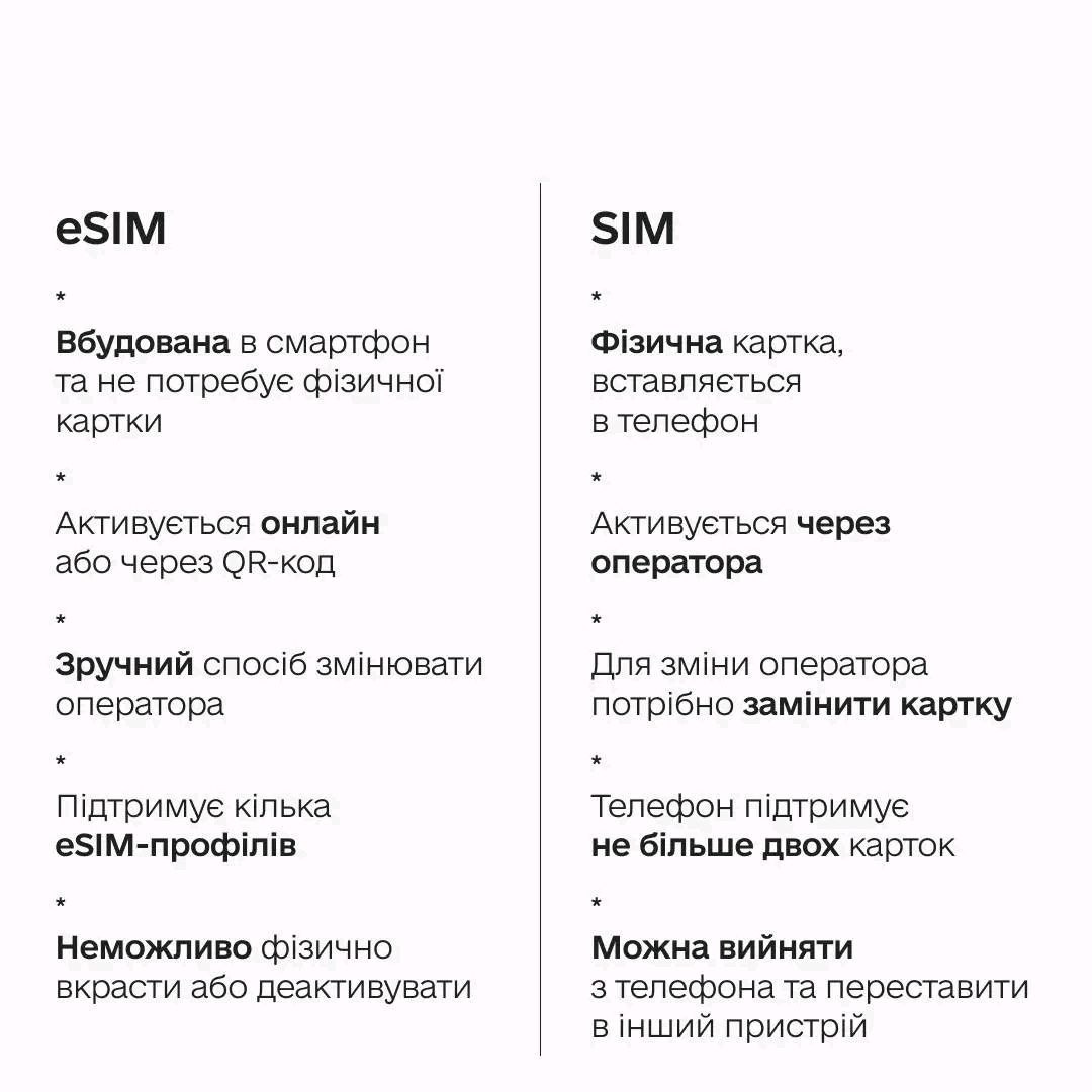 - Потрібна дистанційна активація — eSIM підключається онлайн без відвідування салону.