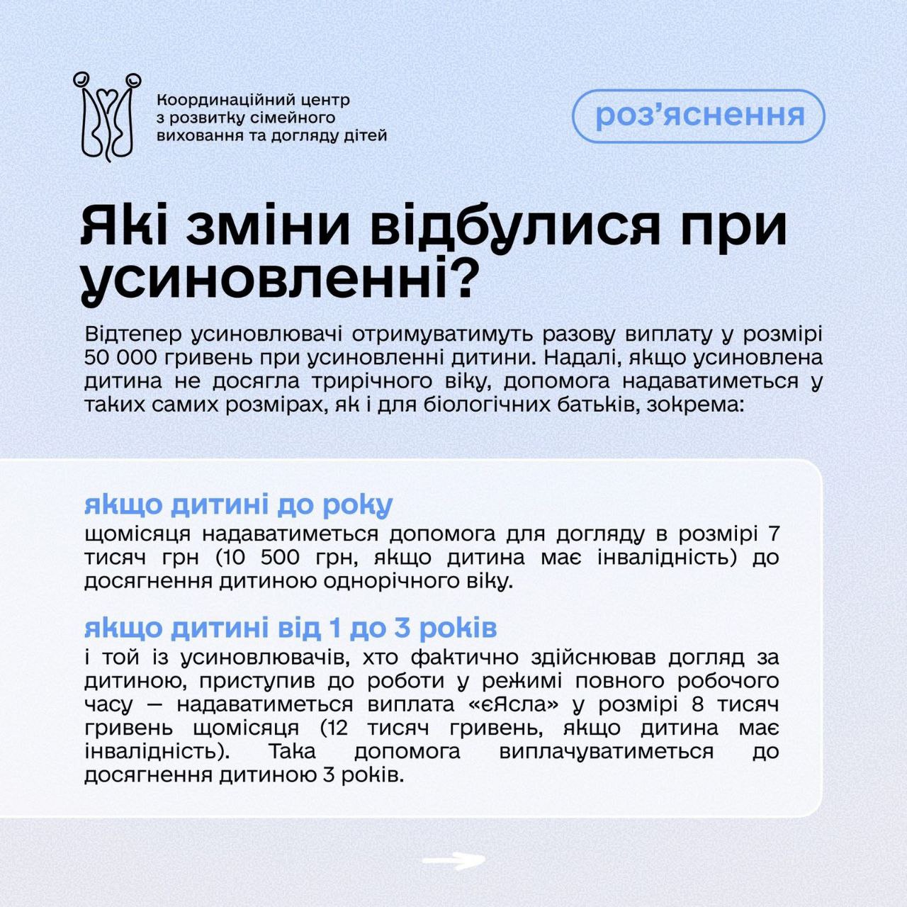 Крім того, збільшено розміри виплат при усиновленні дитини, що є важливим кроком держави на підтримку сімейних форм виховання та турботи про дітей.