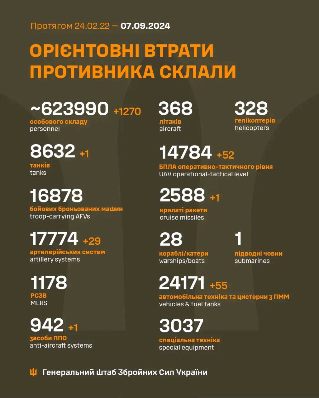 Загальні бойові втрати противника з 24.02.22 по 07.09.24 орієнтовно склали: