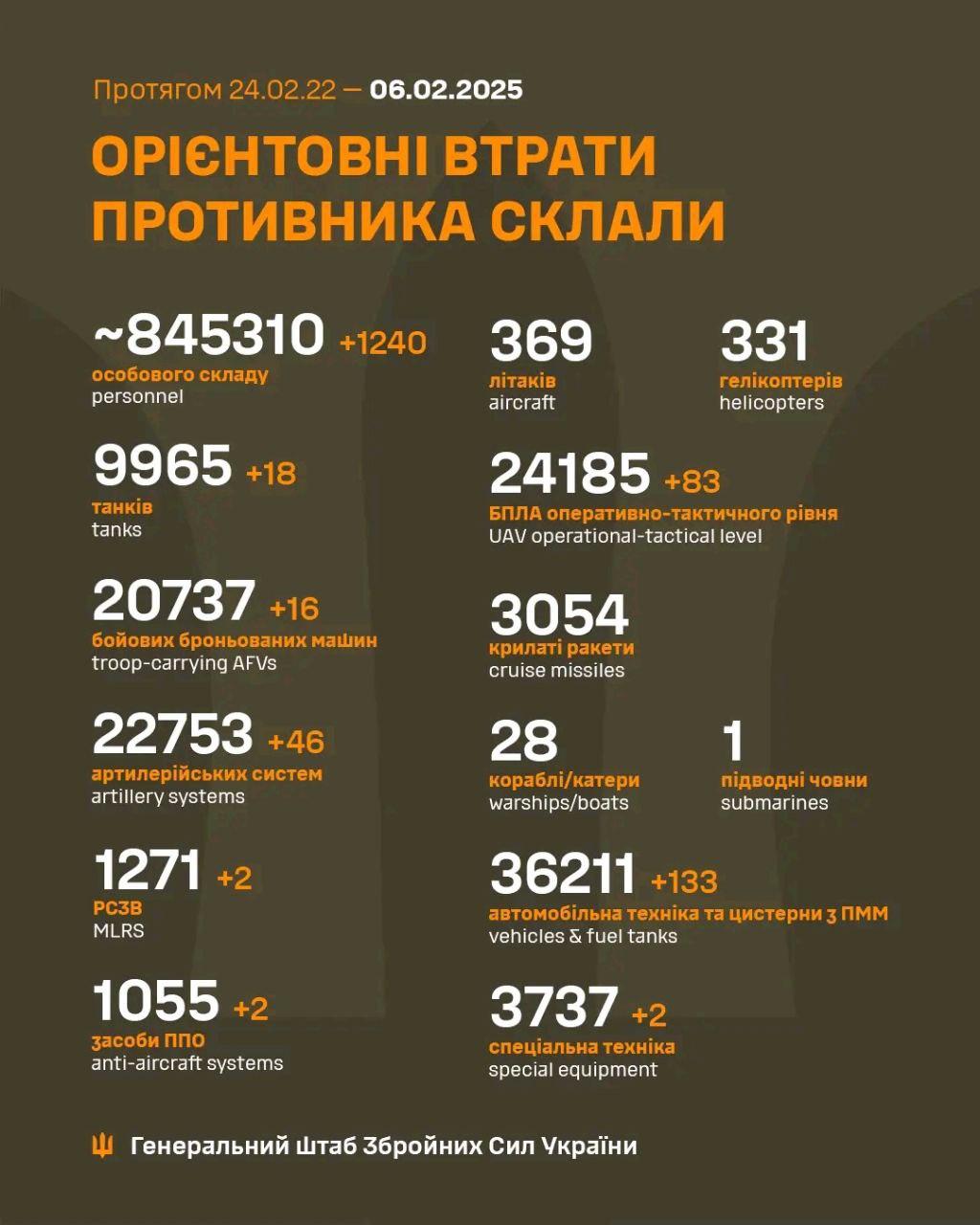 Загальні бойові втрати противника з 24.02.22 по 06.02.25 орієнтовно склали