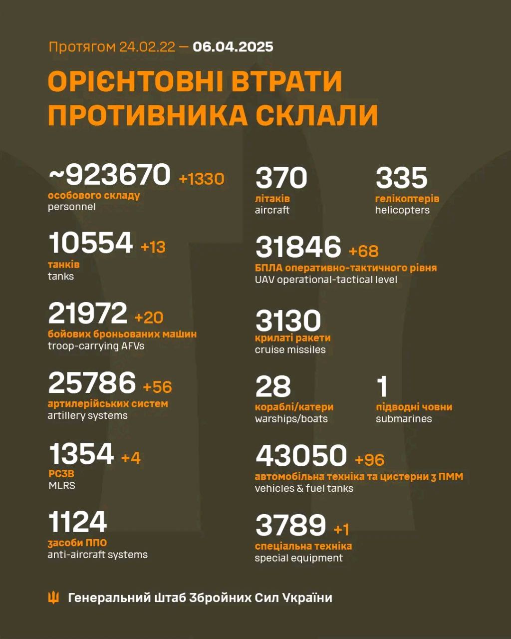 Загальні бойові втрати противника з 24.02.22 по 06.04.25 орієнтовно склали: