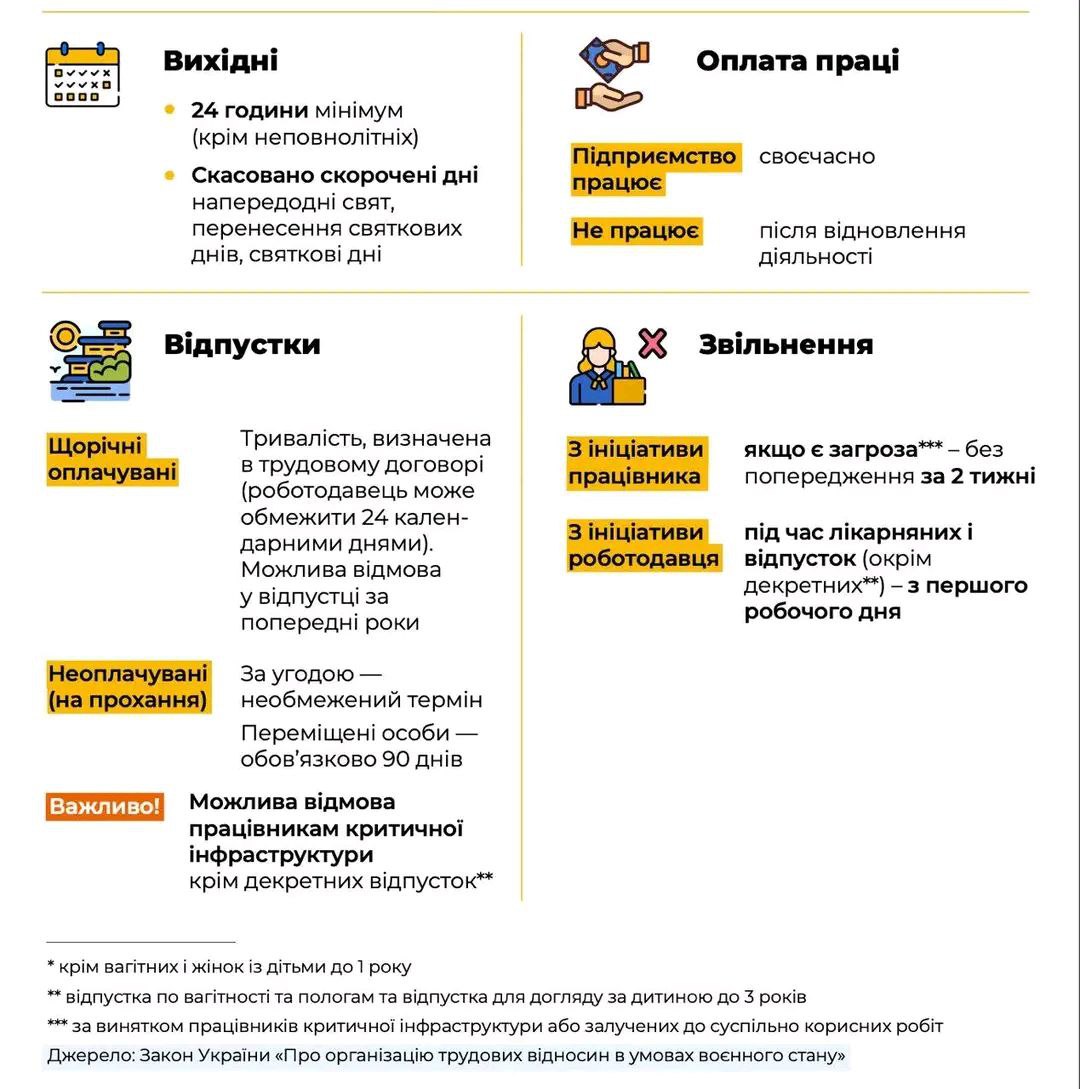 Детальніше про зміни у трудовому законодавстві, що діють під час воєнного стану, – на інфографіці.