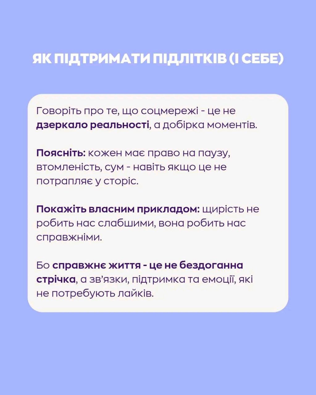 У такі моменти особливо важливо нагадати собі і підліткам: цінність не у тому, як усе виглядає в стрічці, а у тому, що ми відчуваємо в реальному житті.