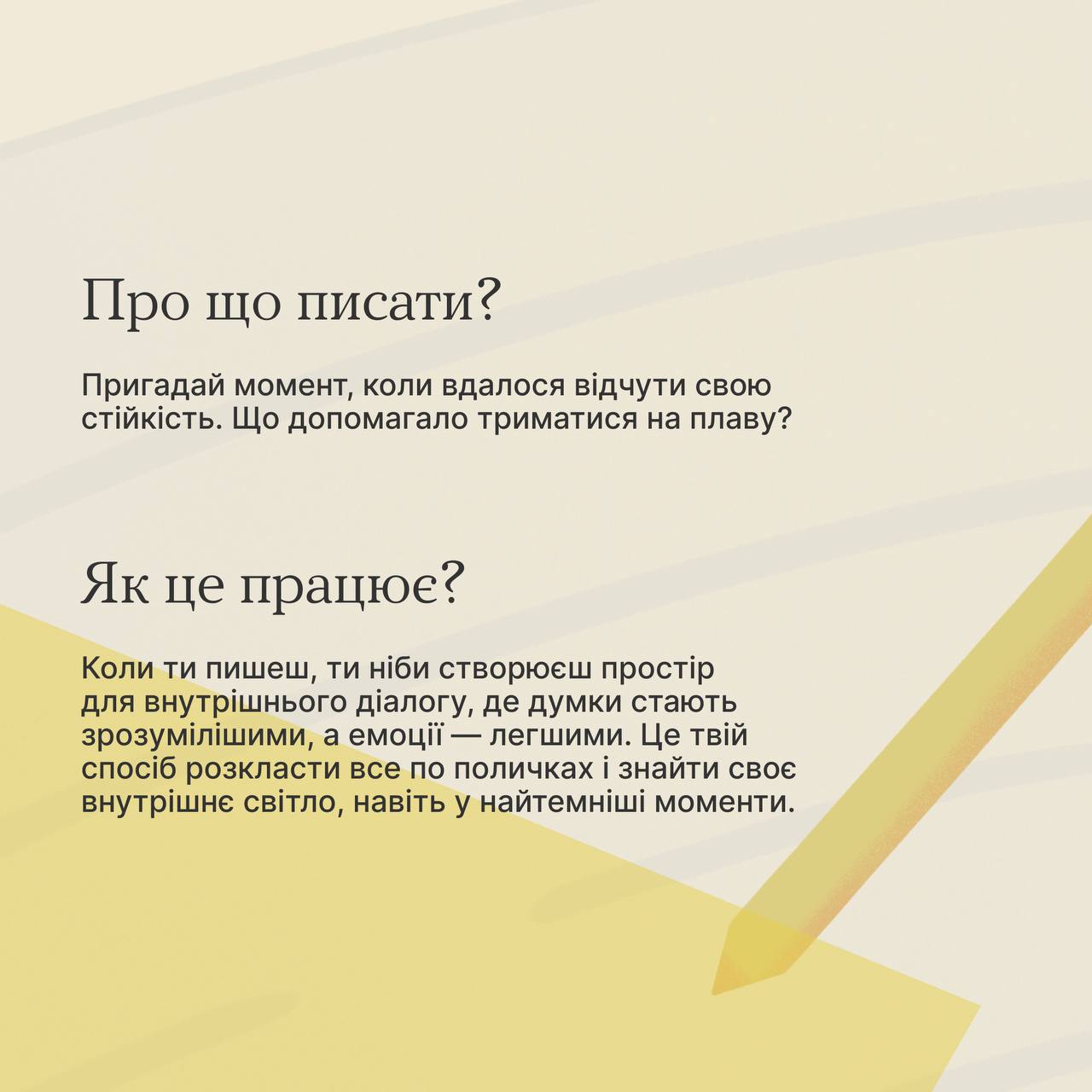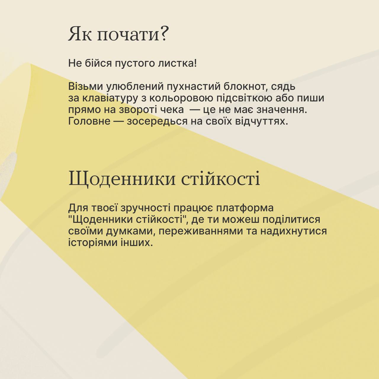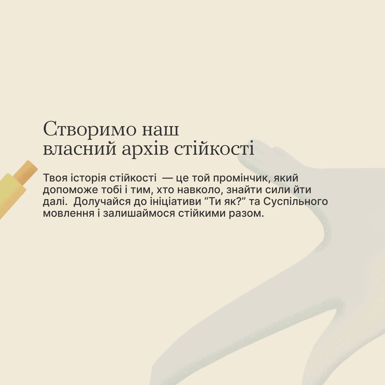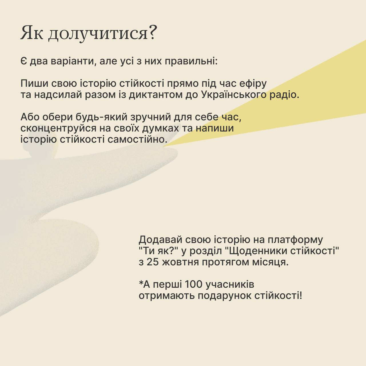 З 25 жовтня протягом місяця пиши свій «Щоденник стійкості» і ділися ним на сторінках платформи «Ти як?» . Твоя історія стійкості може бути не лише прочитана, а й почута в етері Українського Радіо. Адже кожна історія важлива й може стати променем підтримки для інших.