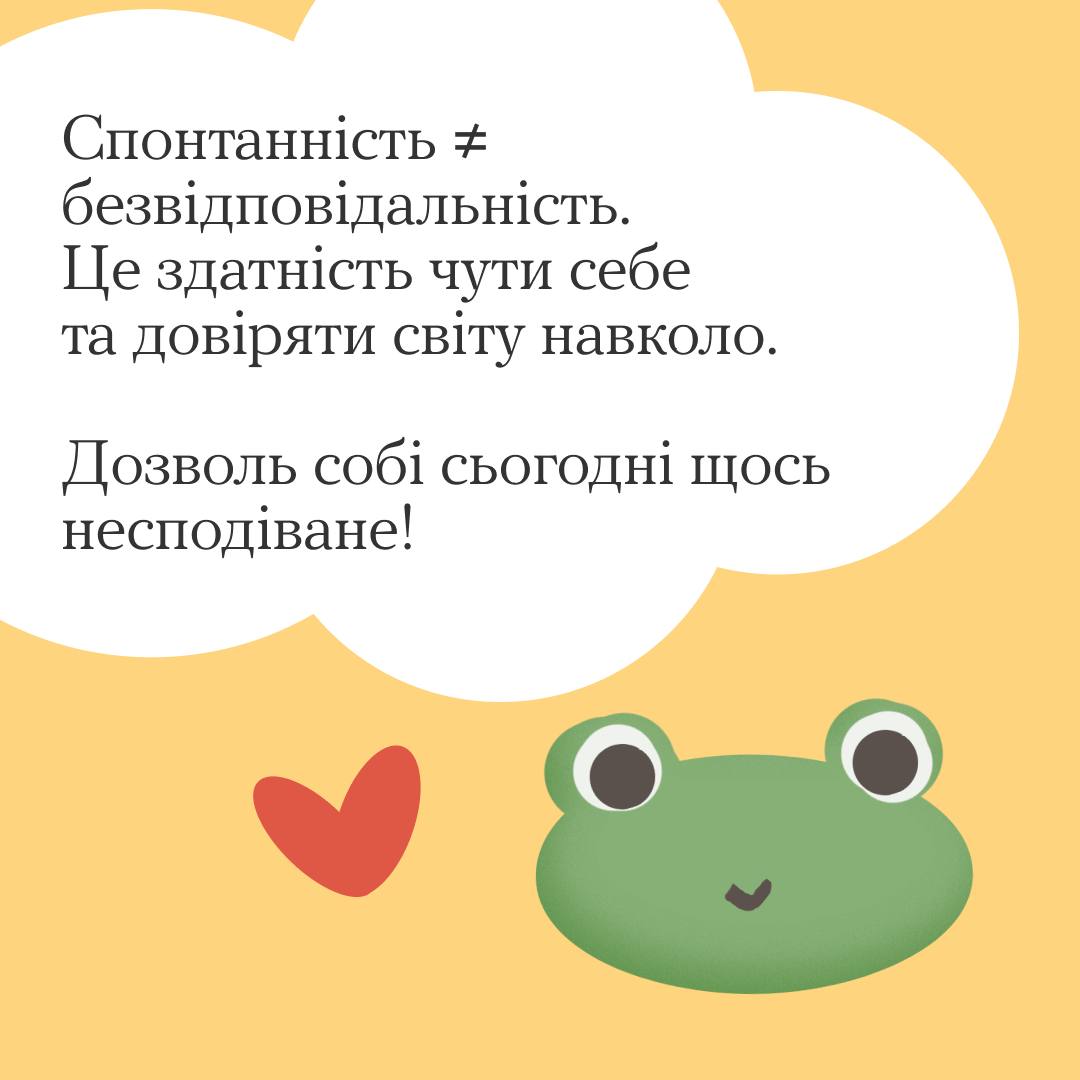 Спонтанність допомагає нам побачити світ ширше, отримати новий досвід і навчитися чути себе та свої бажання, а не тільки те, що «потрібно» чи «правильно» 🤸♀️ Кожен день несе можливість додати більше радості та справжності у своє життя. Не бійся порушити плани, щоб відчути себе тут і зараз.