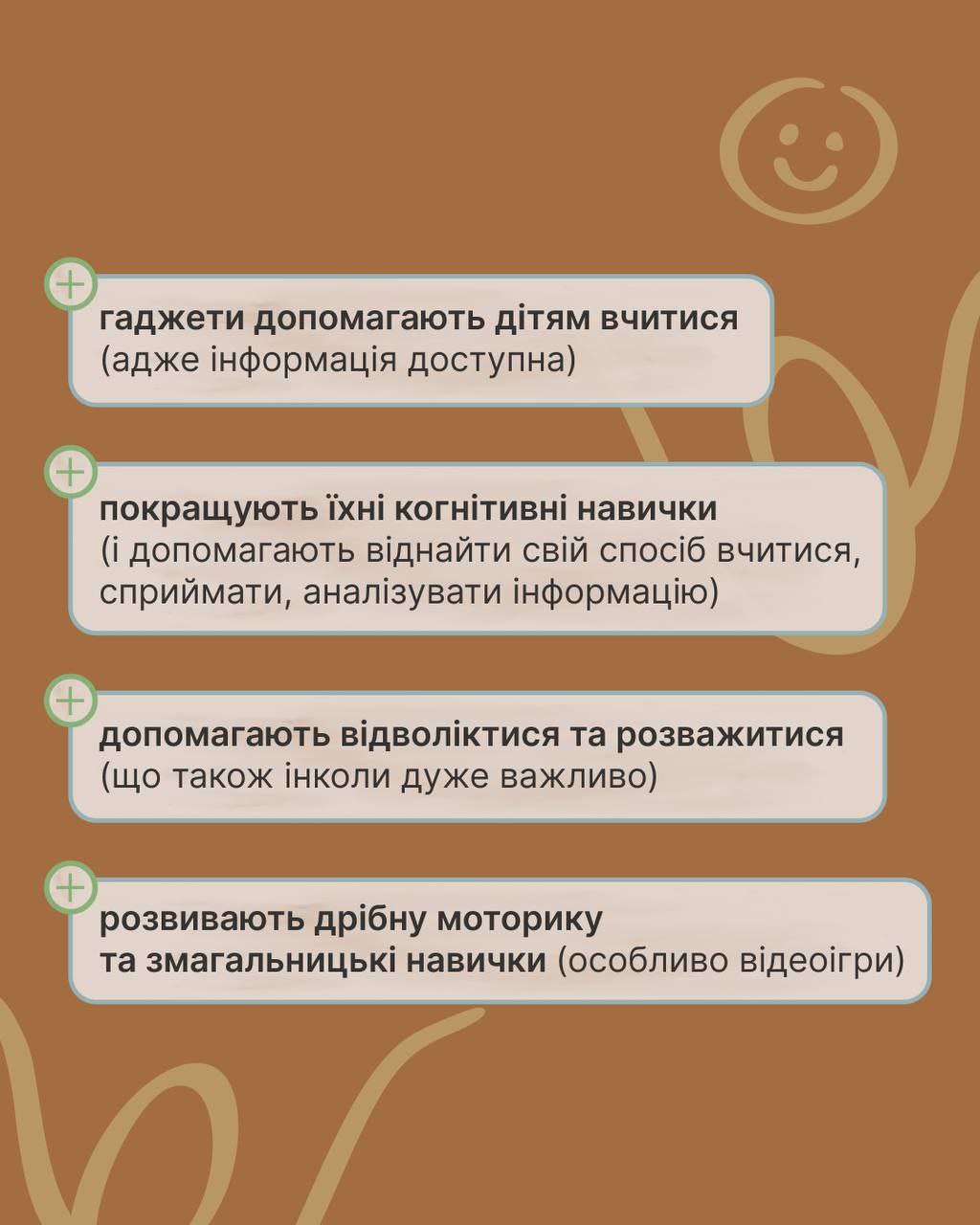 А ще перераховуємо їх плюси і мінуси для дітей — у каруселі. Разом із порадами, як все ж збалансувати час, проведений за блакитними екранами.
