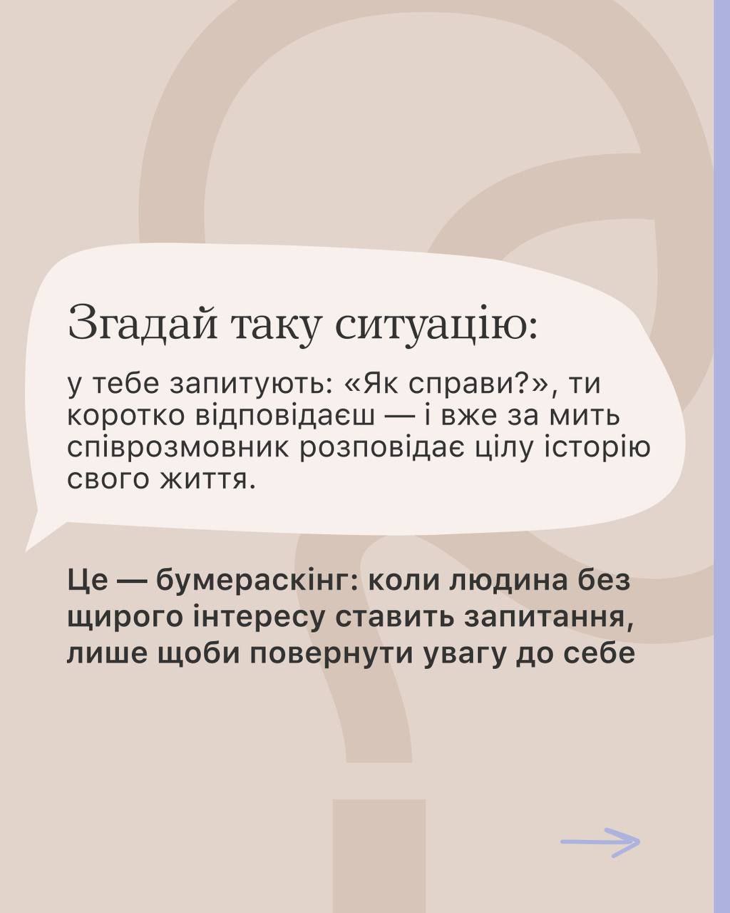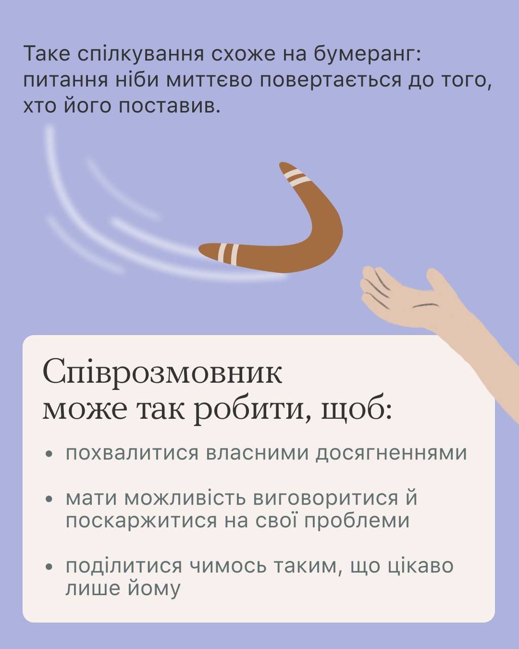 Знаєш слово бумераскінг? Воно не про бумерів, а про всіх нас (ну хоч трохи). Бо інколи ставимо співрозмовнику запитання, просто щоби почати розмову й одразу розказати про своє.