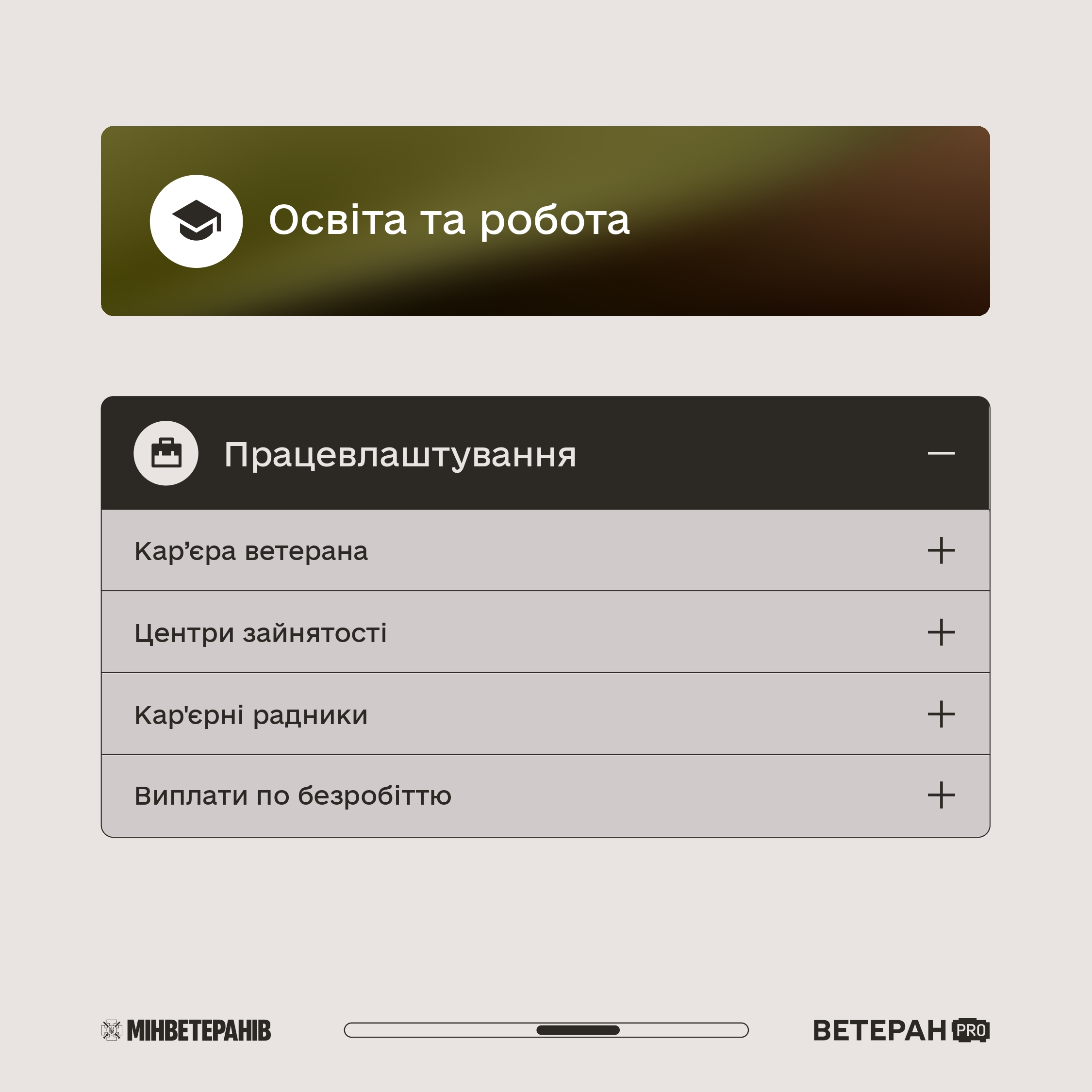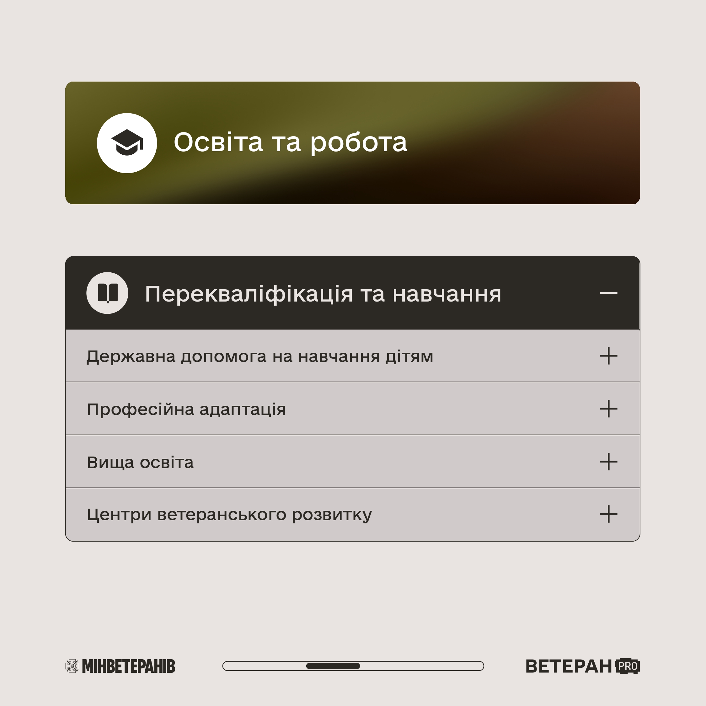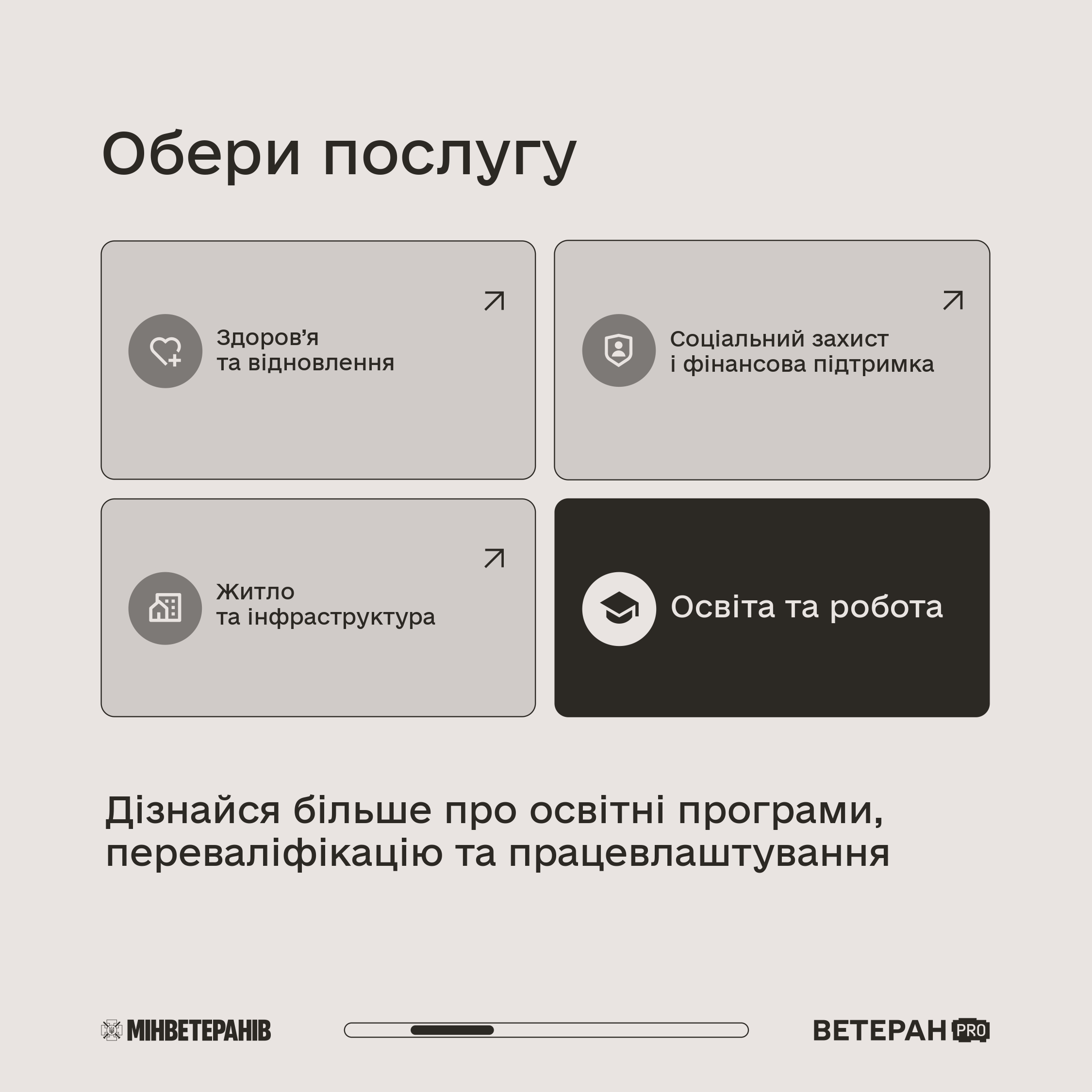На платформі Ветеран Pro зібрана перевірена інформація про державні сервіси: лікування й реабілітацію, фінансову підтримку, пільги, навчання, перекваліфікацію, можливості для роботи чи власної справи, а також про більше послуг.