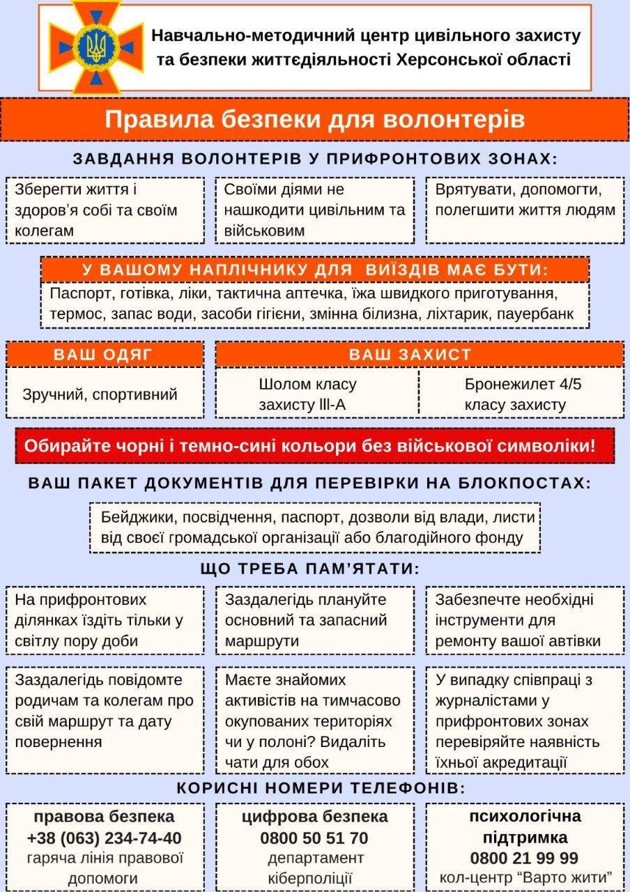 Що необхідно для роботи волонтерів на прифронтовій території — дивіться у пам'ятці від Навчально-методичного центру ЦЗ та БЖД Херсонської області (https://www.facebook.com/metodkabinetNMC )
