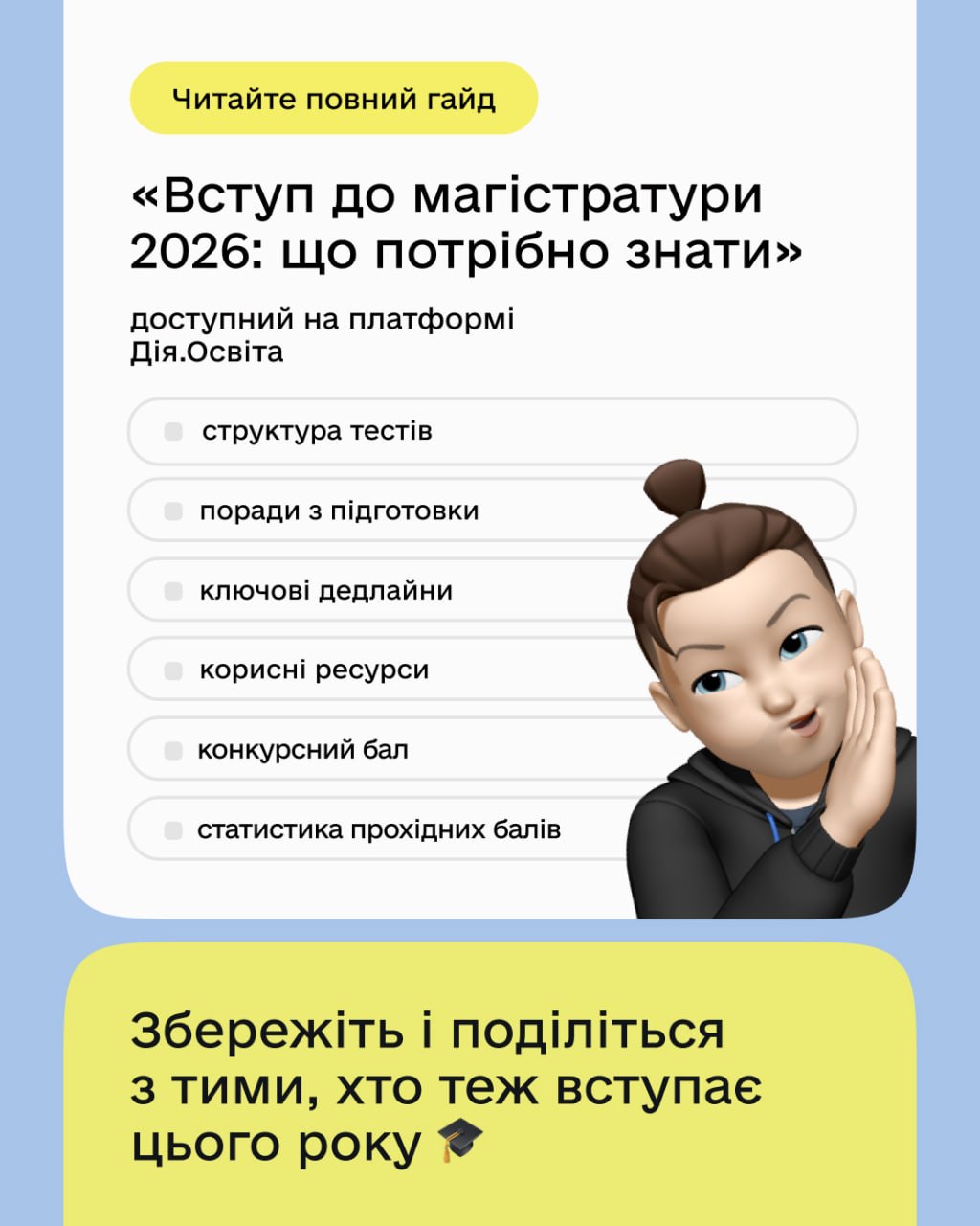 Щоб ви не плуталися в іспитах, правилах і дедлайнах, онлайн-школа @tznk_connected разом із Дія.Освіта підготували гайд «Вступ до магістратури 2026: що потрібно знати» (http://diia.link/r/fbd2).