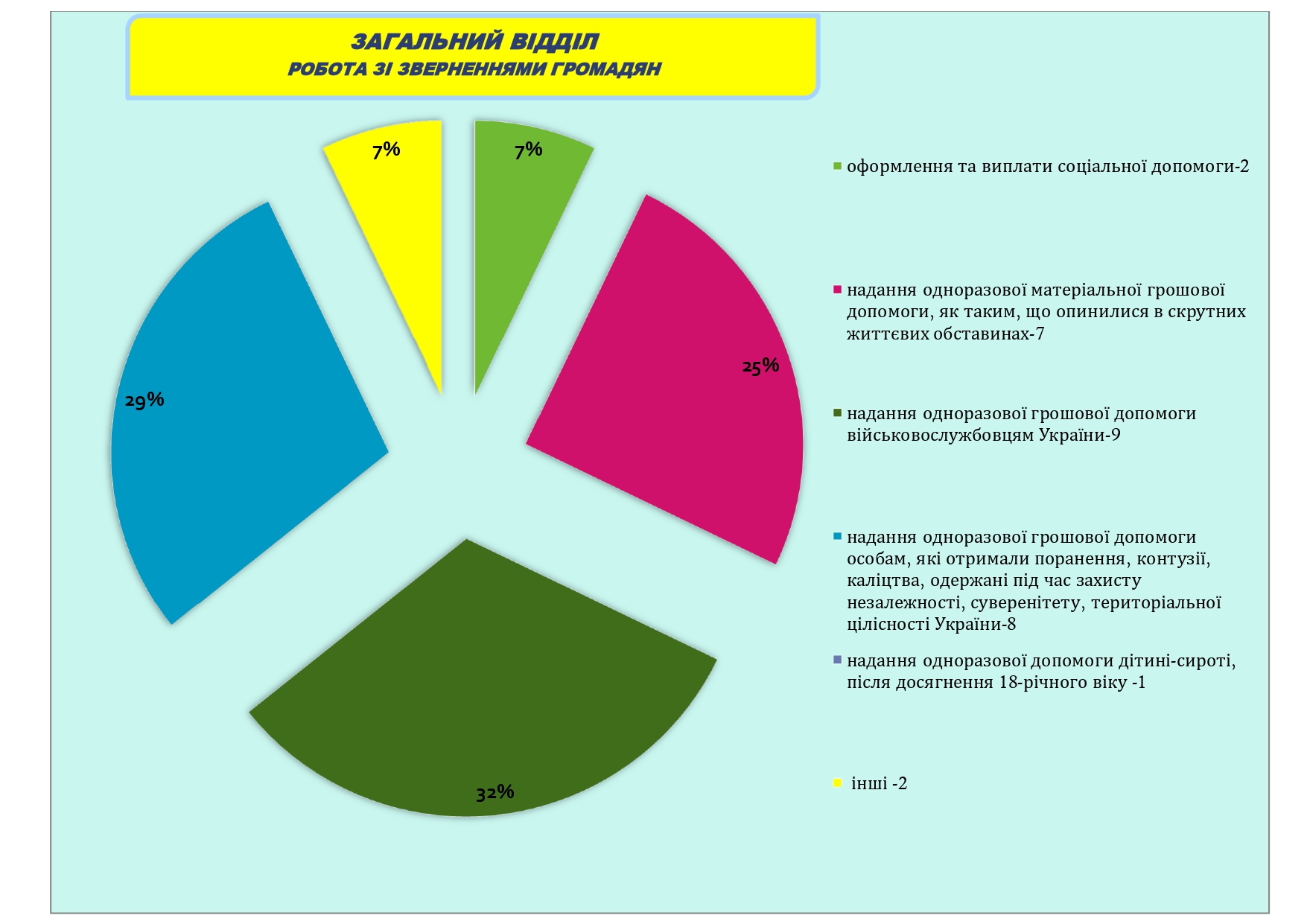 - надання одноразової матеріальної грошової допомоги, як таким, що опинилися в скрутних життєвих обставинах – 7;
