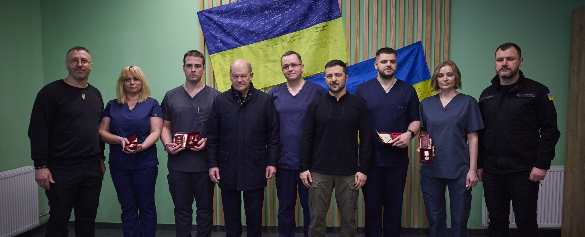 Президент України Володимир Зеленський разом з канцлером відвідали наших воїнів, які були поранені в боях проти окупанта й проходять лікування та реабілітацію