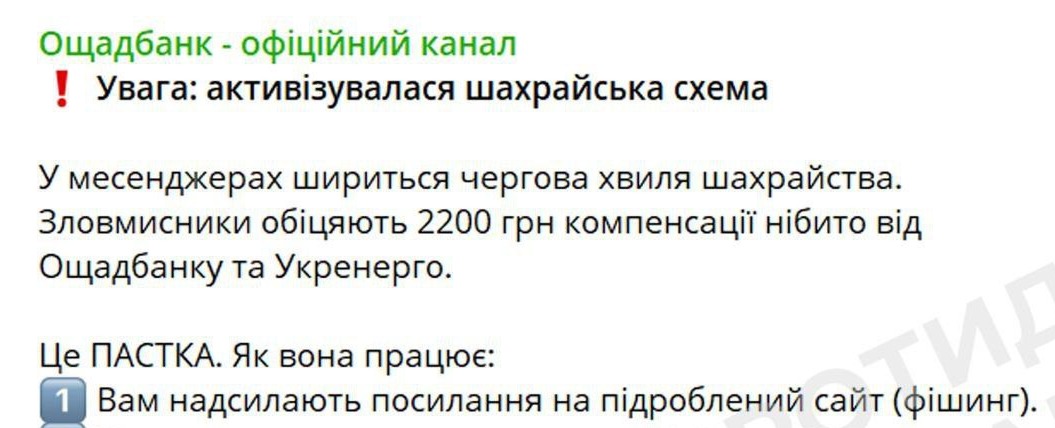 У месенджерах фіксується чергова хвиля шахрайських повідомлень про нібито виплату 2200 грн компенсації від «Ощадбанку» та «Укренерго»