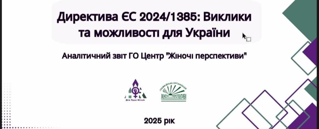 Під час заходу була представлена онлайн-презентація дослідження відповідності українського законодавства вимогам Директиви Європейського Парламенту та Ради ЄС 2024/1385 щодо протидії насильству стосовно жінок і домашньому насильству.