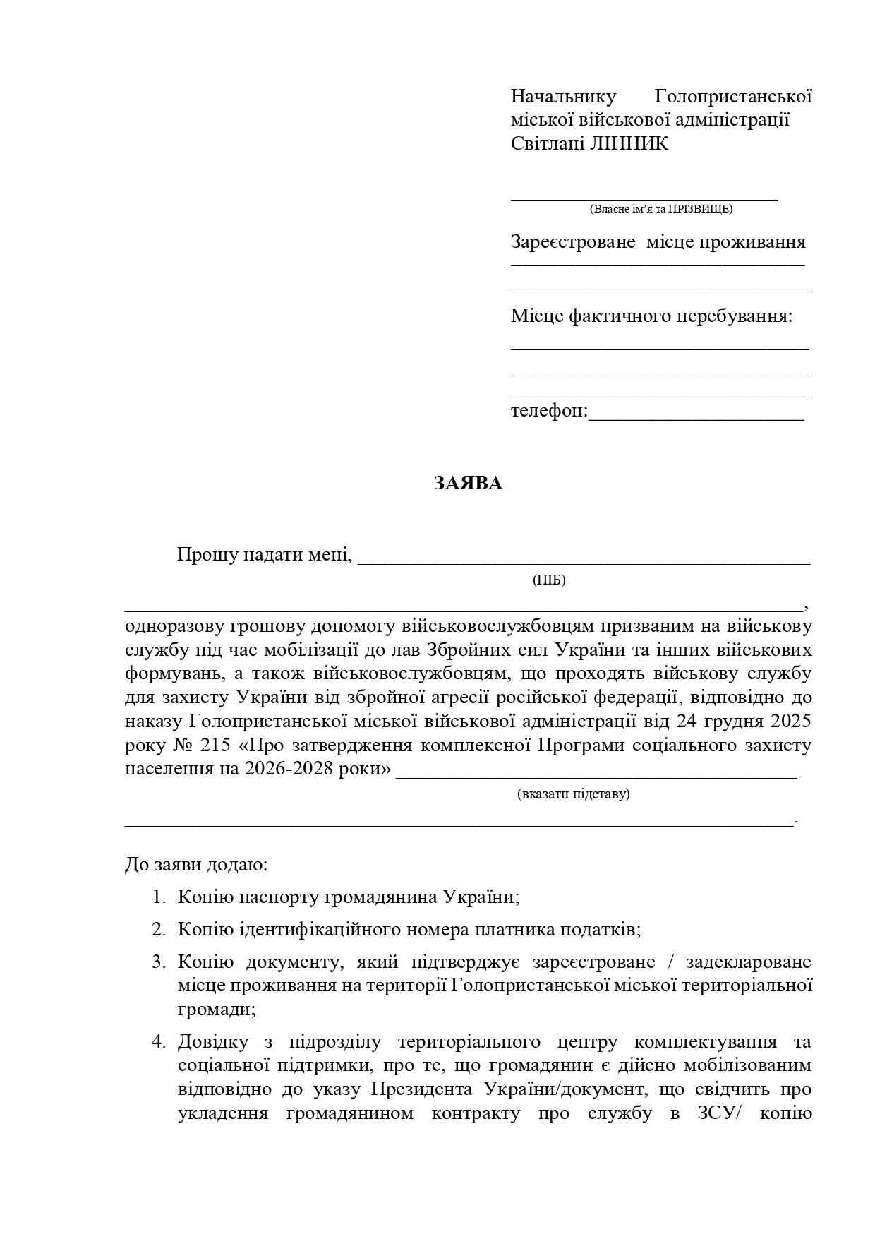 - заява на ім’я керівника УСЗН СП ВК або на ім’я керівника Голопристанської міської військової адміністрації/виконавчого комітету Голопристанської міської ради;